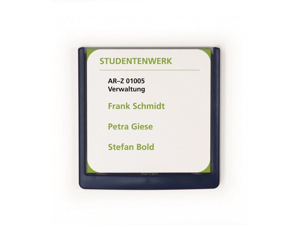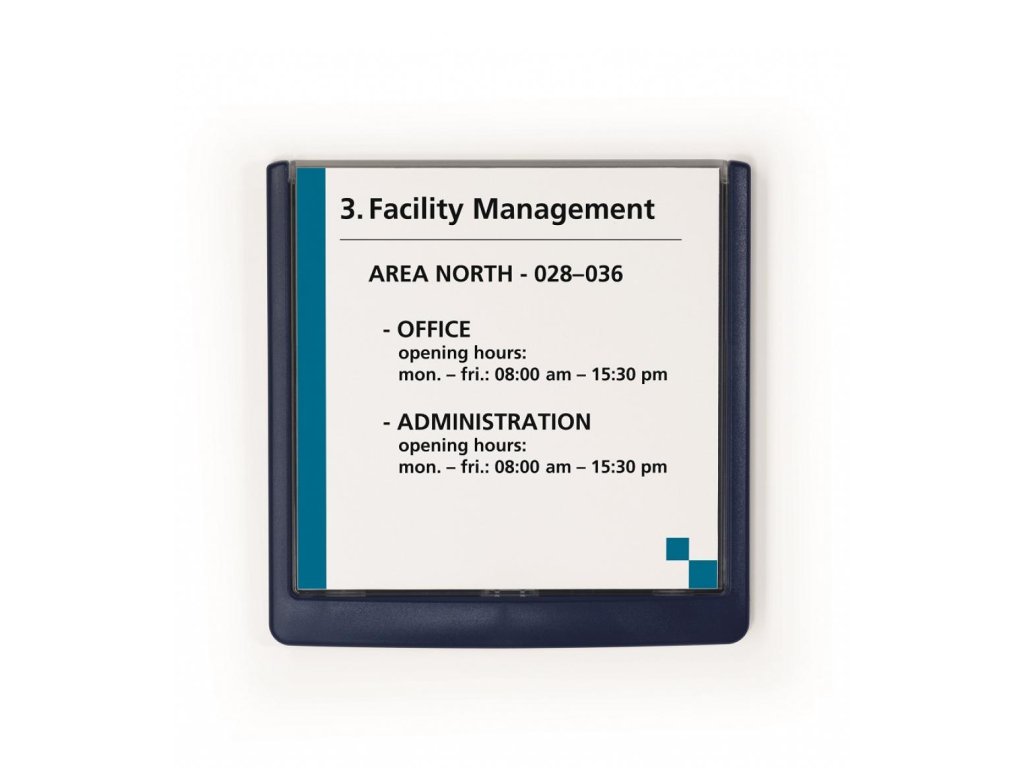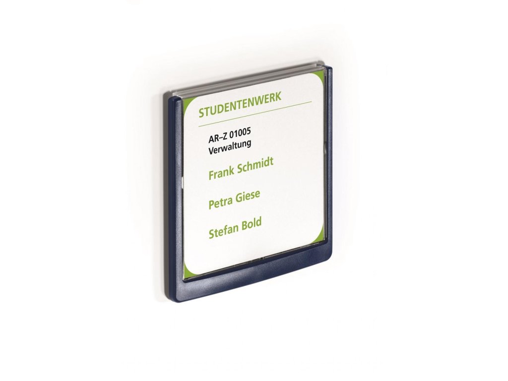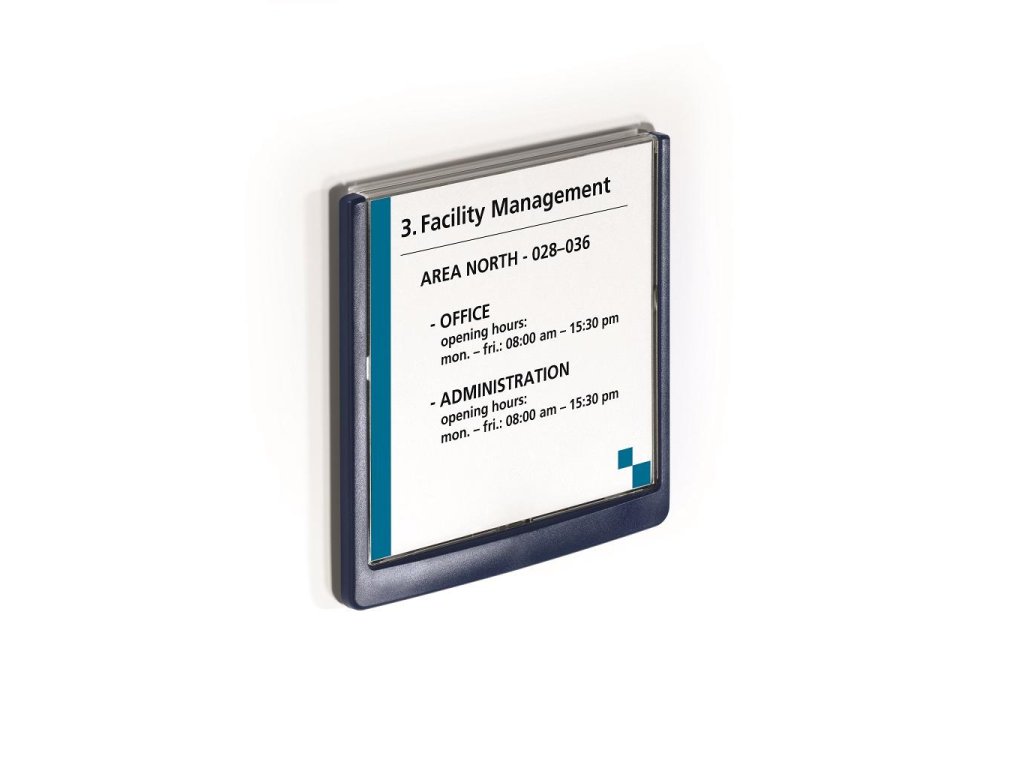 Moderná informačná tabuľka na dvere s lemom v atraktívnej modrej farbe. Predný panel sa otvára na jedno zatlačenie, a tým sa jednoducho sprístupnia vložené popisné papiere, ktoré sa môžu vymieňať podľa potrieb. Tabuľka je ideálna do kancelárií, úradov, škôl, univerzít a hotelov. Súčasťou balenia je montážna sada s názorným návodom. Namiesto pevného montovania môže byť tabuľka k povrchu aj prilepená.Rozmery: 149 x 148,5 mm