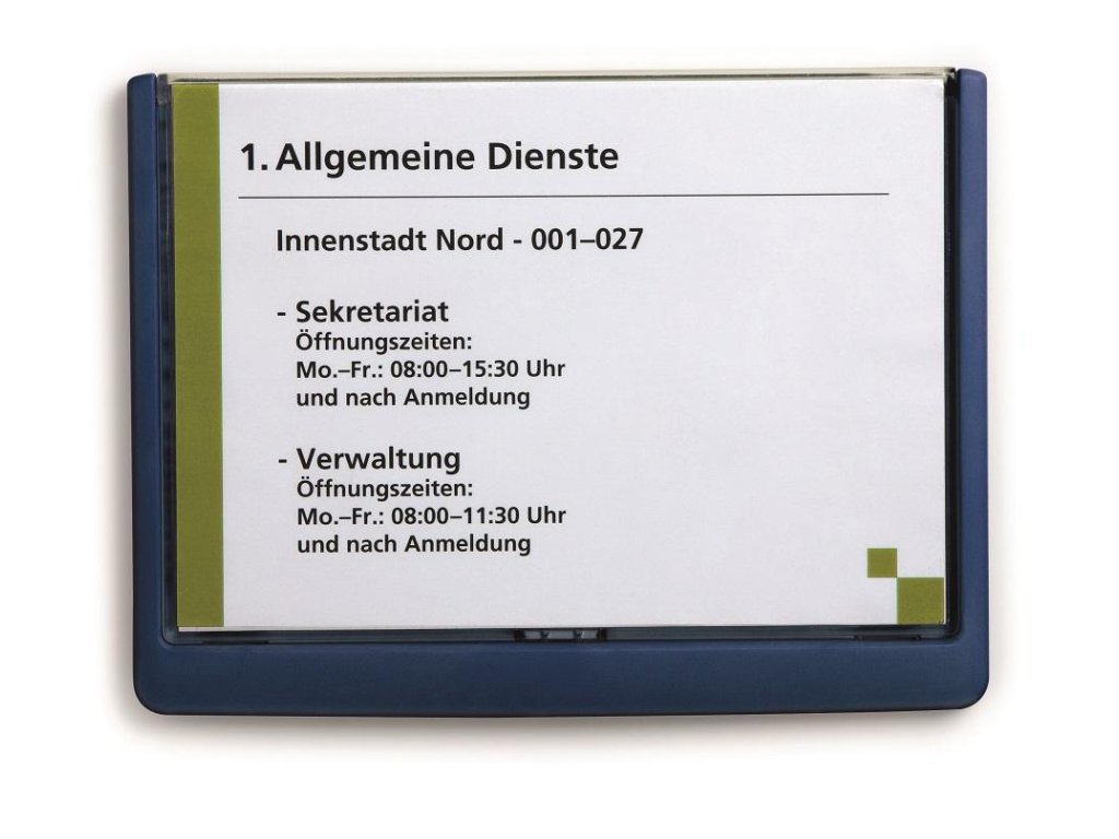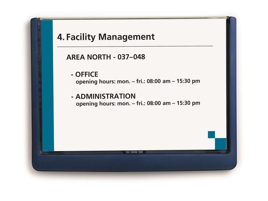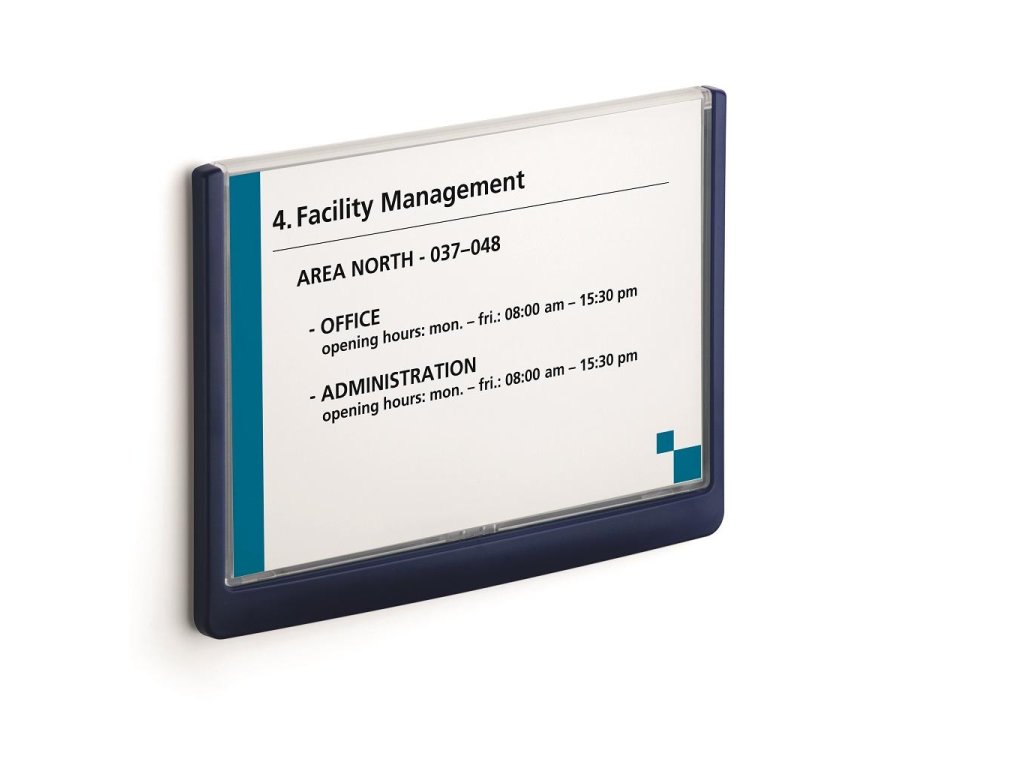 Moderná informačná tabuľka na dvere s lemom v atraktívnej modrej farbe. Predný panel sa otvára na jedno zatlačenie, a tým sa jednoducho sprístupnia vložené popisné papiere, ktoré sa môžu vymieňať podľa potrieb. Tabuľka je ideálna do kancelárií, úradov, škôl, univerzít a hotelov. Súčasťou balenia je montážna sada s názorným návodom. Namiesto pevného montovania môže byť tabuľka k povrchu aj prilepená.Rozmery: 210 x 148,5 mm