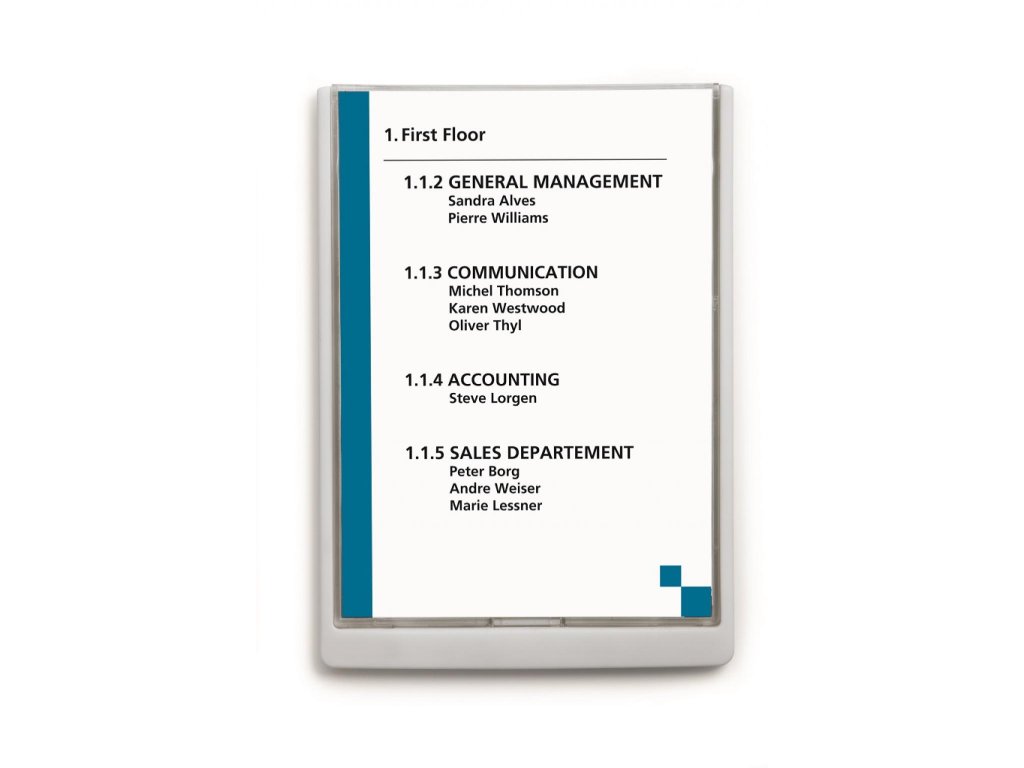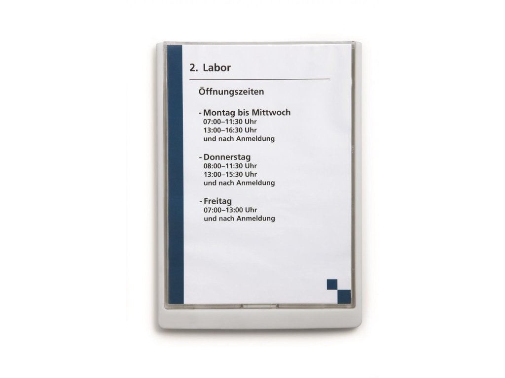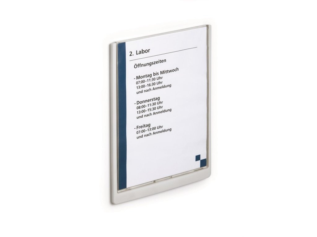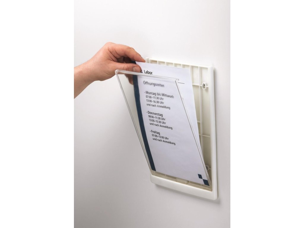 Moderná informačná tabuľka na dvere s lemom v atraktívnej bielej farbe. Predný panel sa otvára na jedno zatlačenie, a tým sa jednoducho sprístupnia vložené popisné papiere, ktoré sa môžu vymieňať podľa potrieb. Tabuľka je ideálna do kancelárií, úradov, škôl, univerzít a hotelov. Súčasťou balenia je montážna sada s názorným návodom. Namiesto pevného montovania môže byť tabuľka k povrchu aj prilepená.Rozmery: 210 x 297 mm