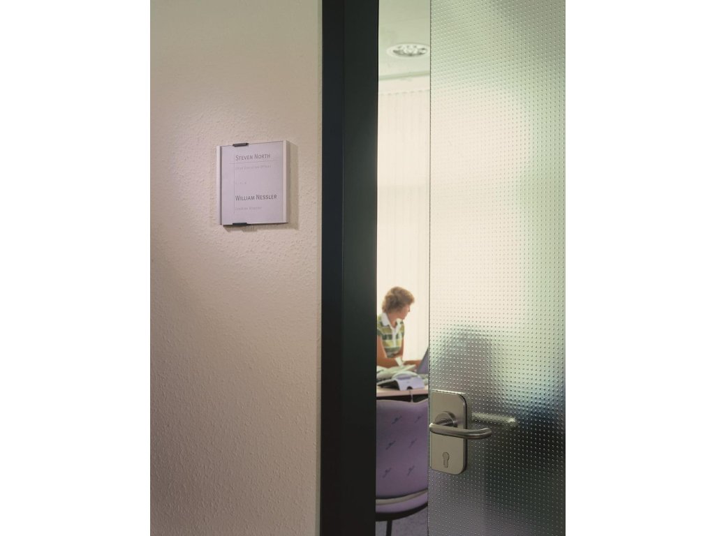 Informačná tabuľka na dvere. Štylizovaná tabuľka vo vrúbkovanej úprave, spodná časť z vysoko kvalitného hliníka, fixujúce spojky v čiernej farbe. K podkladu môže byť zadnou časťou priskrutkovaná alebo nalepená. Text je chránený neoslňujúcim akrylátovým krytom, ktorý pridržiavajú dve fixujúce spojky. Súčasťou balenia je montážna sada s názorným návodom a čistým listom papiera vo veľkosti tabuľky.Rozmery: 149x148,5 mm