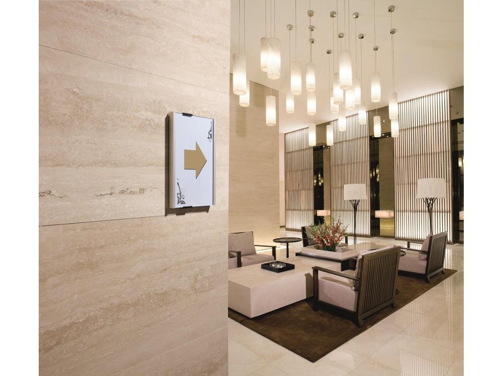 Informačná tabuľka na dvere. Štylizovaná tabuľka vo vrúbkovanej úprave, spodná časť z vysoko kvalitného hliníka, fixujúce spojky v čiernej farbe. K podkladu môže byť zadnou časťou priskrutkovaná alebo nalepená. Text je chránený neoslňujúcim akrylátovým krytom, ktorý pridržiavajú dve fixujúce spojky. Súčasťou balenia je montážna sada s názorným návodom a čistým listom papiera vo veľkosti tabuľky.Rozmery: 149x210,5 mm