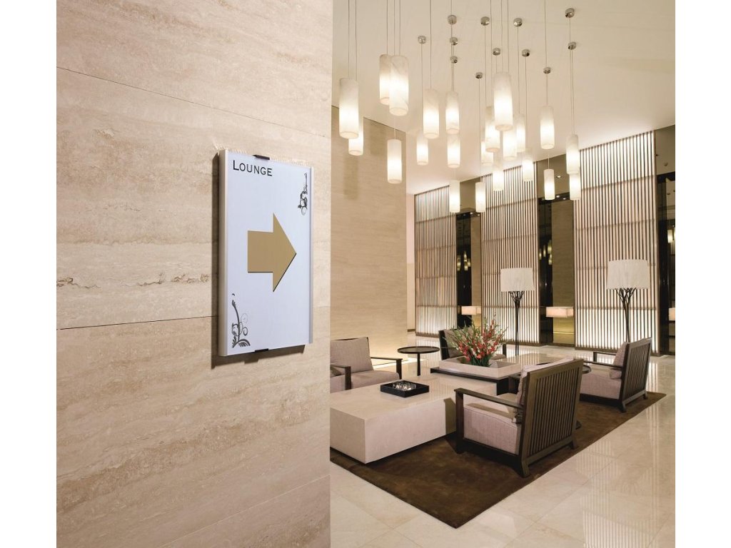 Informačná tabuľka na dvere. Štylizovaná tabuľka vo vrúbkovanej úprave, spodná časť z vysoko kvalitného hliníka, fixujúce spojky v čiernej farbe. K podkladu môže byť zadnou časťou priskrutkovaná alebo nalepená. Text je chránený neoslňujúcim akrylátovým krytom, ktorý pridržiavajú dve fixujúce spojky. Súčasťou balenia je montážna sada s názorným návodom a čistým listom papiera vo veľkosti tabuľky.Rozmery: 210x297 mm