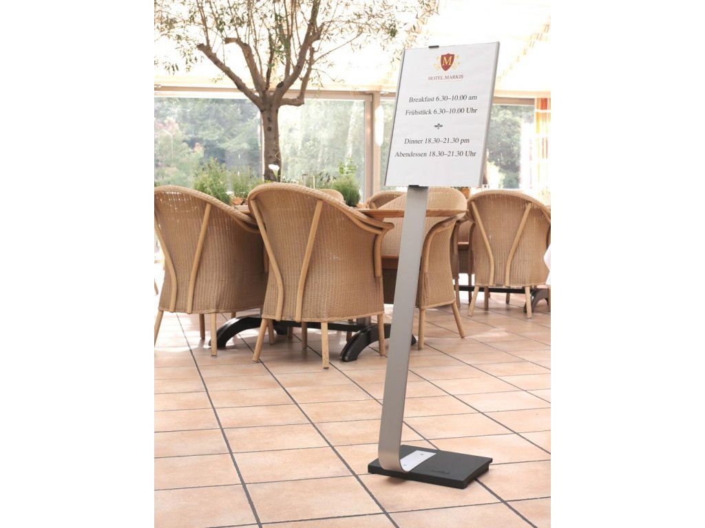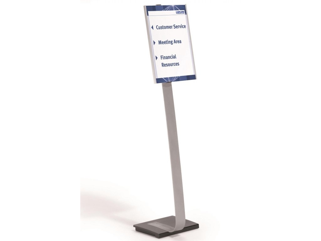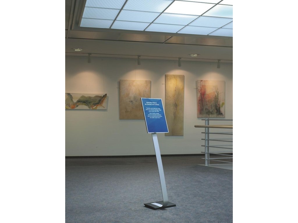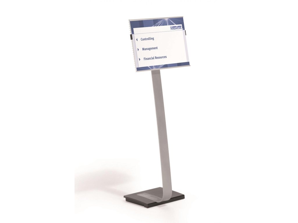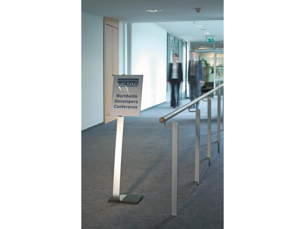Vysoko kvalitný elegantný hliníkový stojan s informačným panelom formátu A3, použiteľným na výšku alebo na šírku. Zaťaženie stojana a gumové podložky zabezpečujú stabilitu. Protiodrazový panel je možné otočiť vertikálne alebo horizontálne a naklápať v rozmedzí 10 stupňov.Šablóny na potlač sú voľné stiahnuteľné na www.durable.de.Maximálna výška: 1,25 m/1,2 m