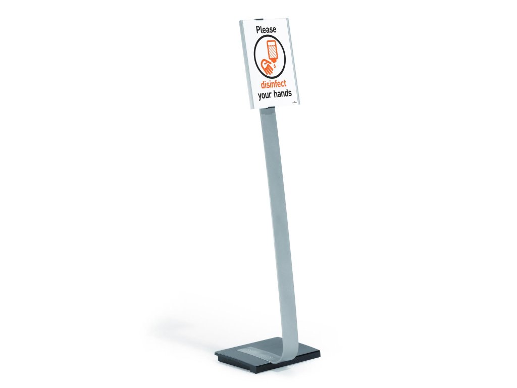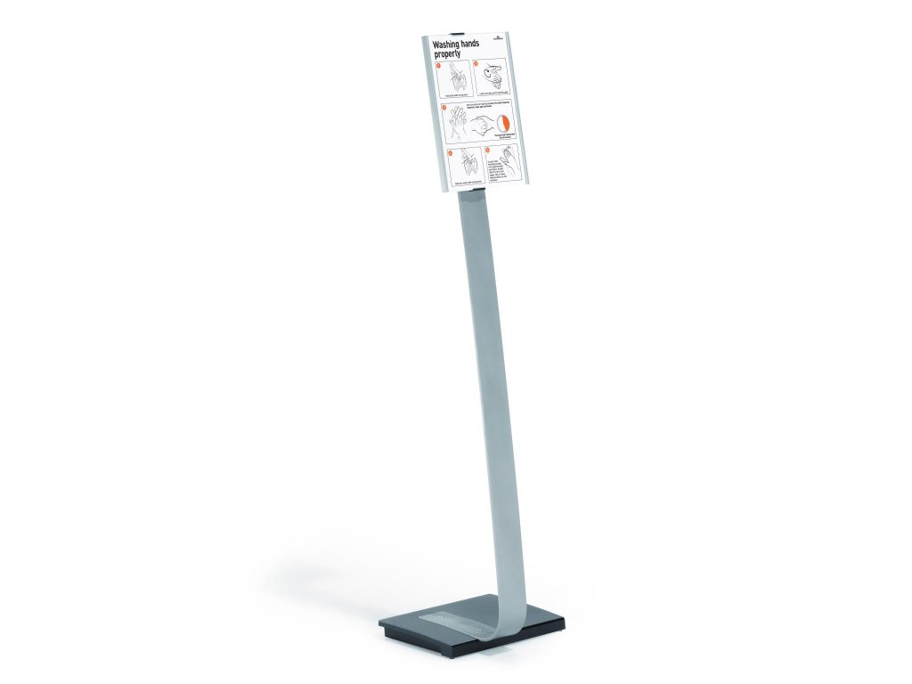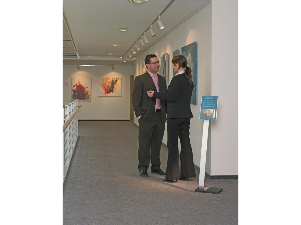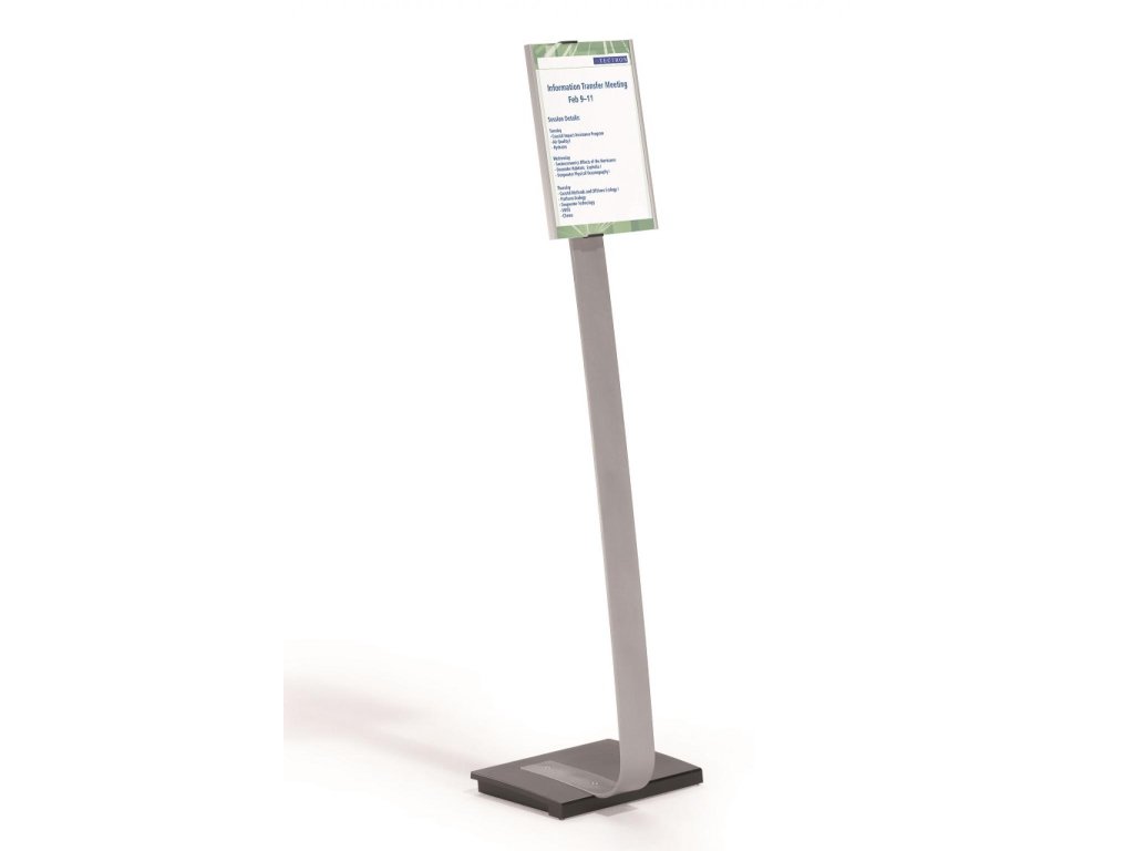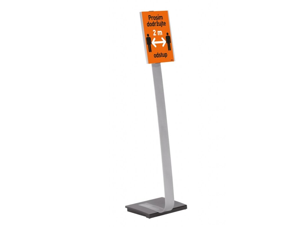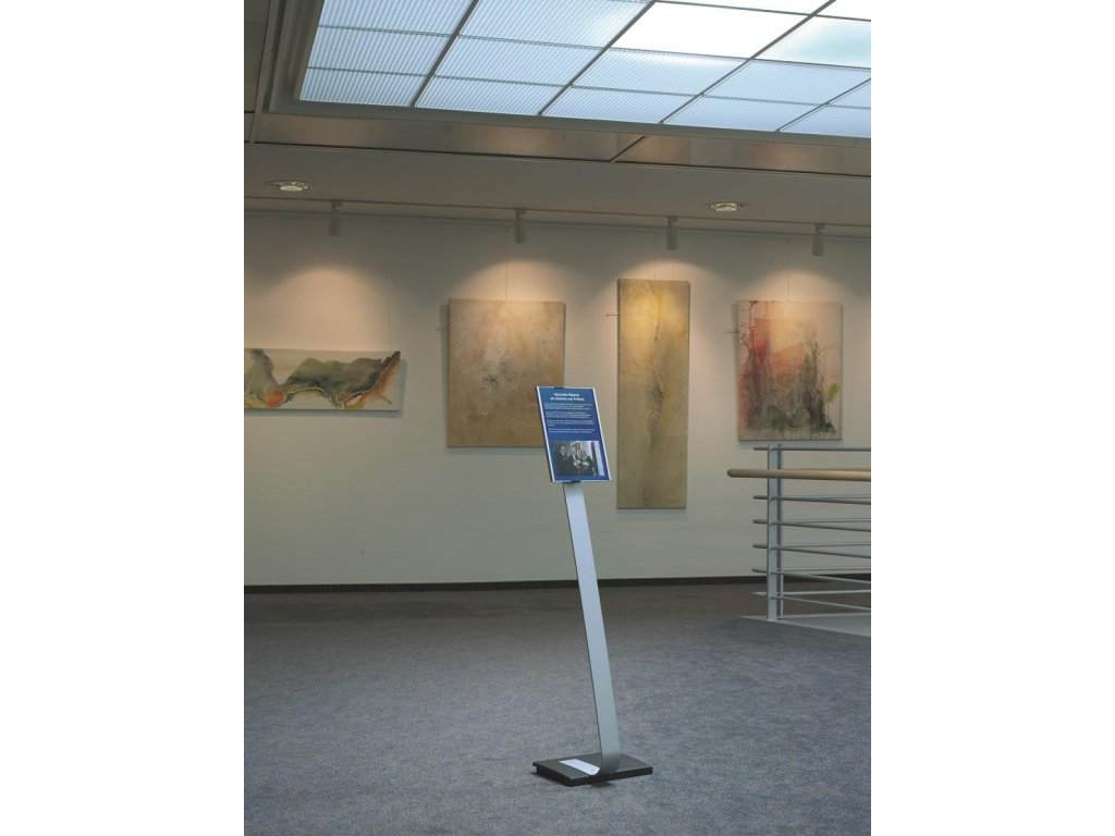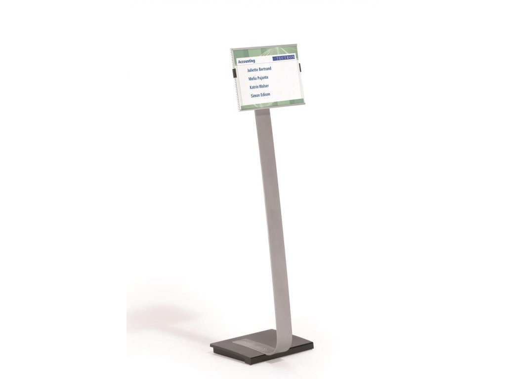 Vysoko kvalitný elegantný hliníkový stojan s informačným panelom formátu A4, použiteľným na výšku alebo na šírku. Zaťaženie stojana a gumové podložky zabezpečujú stabilitu. Protiodrazový panel je možné otočiť vertikálne alebo horizontálne a naklápať v rozmedzí 10 stupňov.Šablóny na potlač sú voľné stiahnuteľné na www.durable.de.Maximálna výška: 1,18 m/1,13 m
