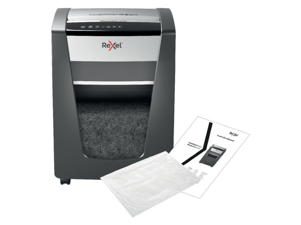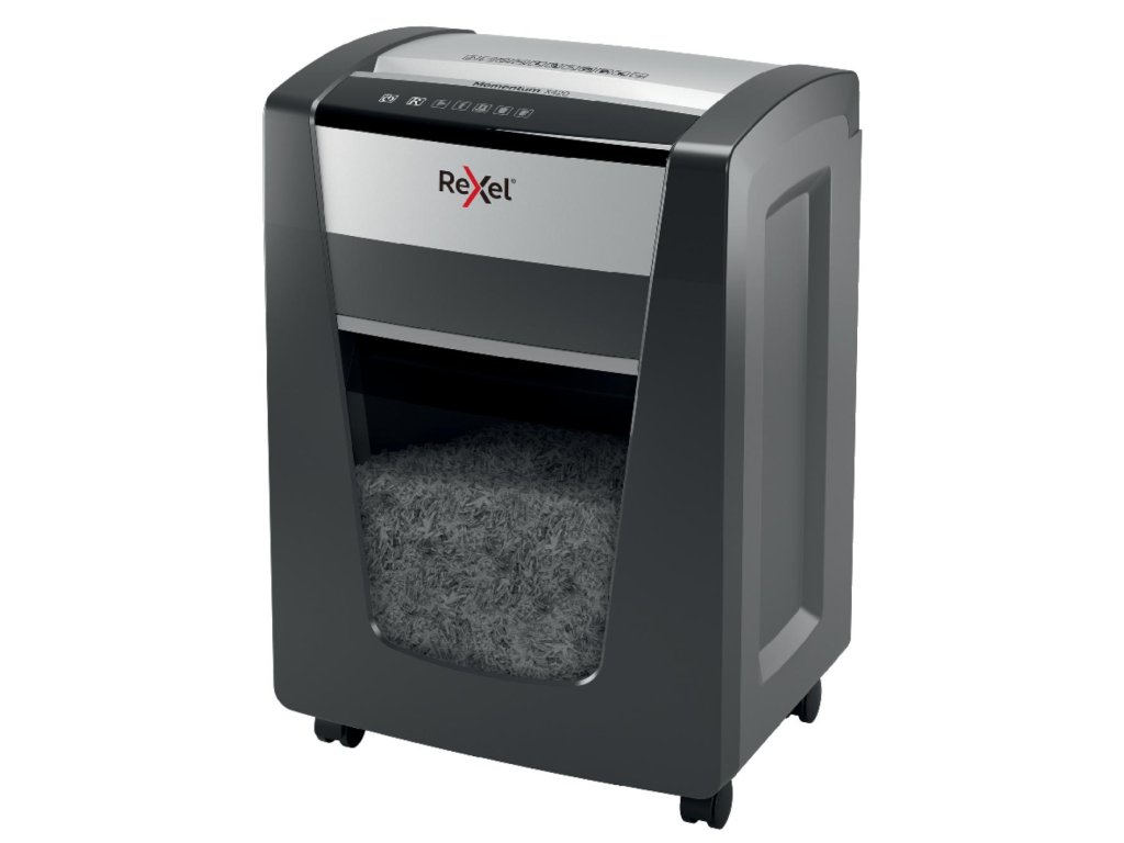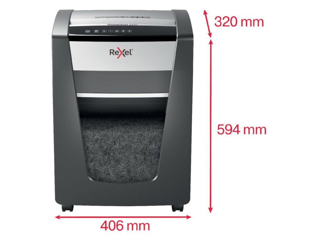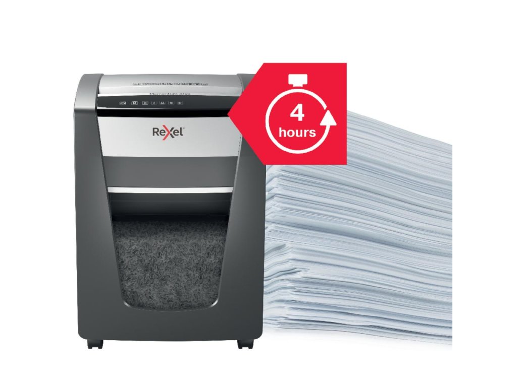 Nezastaviteľná skartovačka! Rexel Momentum X420 skartuje až 20 hárkov naraz a vydrží v nepretržitom chode 4 hodiny, vhodný na použitie v menších kanceláriách. Technológia proti zaseknutiu papiera garantuje neprerušované skartovanie. Krížový rez na úrovni zabezpečenia P4 reže papier na časti s veľkosťou 4 × 40 mm. Dotykové ovládanie pre jednoduché a intuitívne ovládanie. Objemný kôš s kapacitou 30 l pojme 275 hárkov A4.