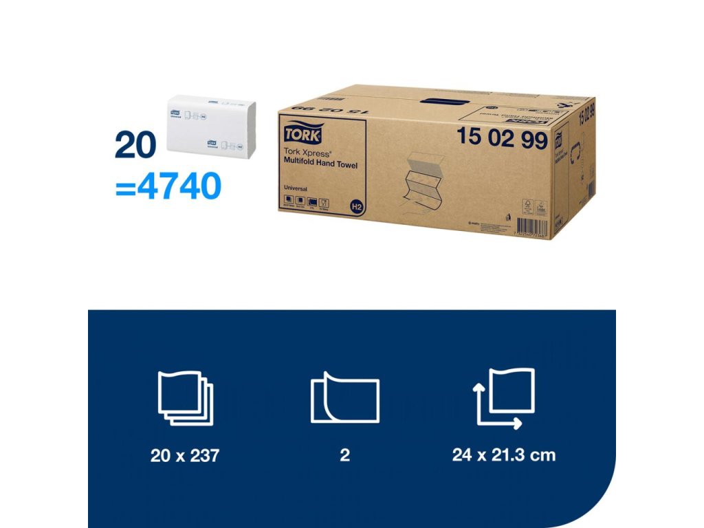 Papierové utierky skladané, recyklované 2-vrstvové sú vhodné do Tork Xpress® zásobníka v systéme H2 na papierové utierky Multifold v stredne frekventovaných toaletách a umyvárňach. Možno ich použiť do malých priestorov.Farba: biela