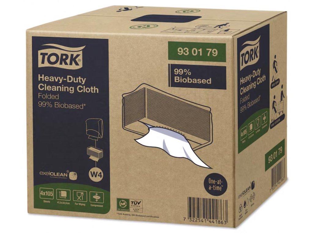 Tieto čistiace utierky na prírodnom základe* účinne absorbujú a čistia mastnotu aj nečistoty. Vďaka vydávaniu po útržku a ich vysoko odolnému dizajnu ich môžete opakovane použiť, a tak znížiť náklady aj spotrebu. Vysoký výkon a udržateľnosť v jednom. Vonkajší aj vnútorný obal je vyrobený z recyklovaných materiálov, čo znásobí váš ekologický imidž. * TÜV Austria, OK Biobased certifikovaný produkt. ** 100 % recyklované kartónové vlákna, 30 % recyklované plasty.- Ich pevná textúra a vysoká absorpčná schopnosť z nich robí ideálne utierky na utieranie oleja, tuku, mazadiel a špiny.