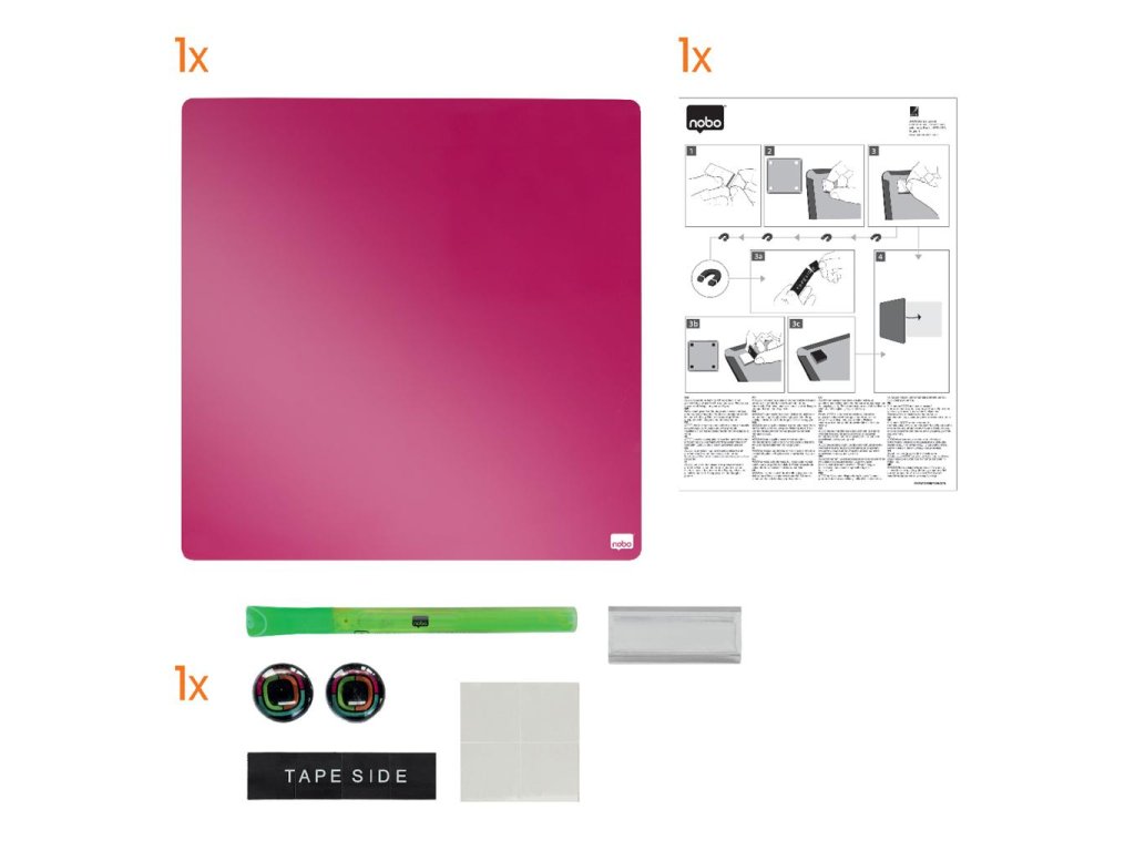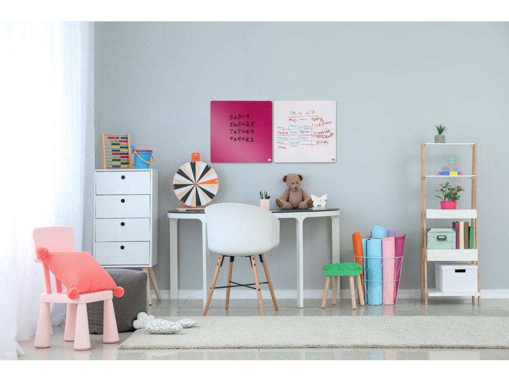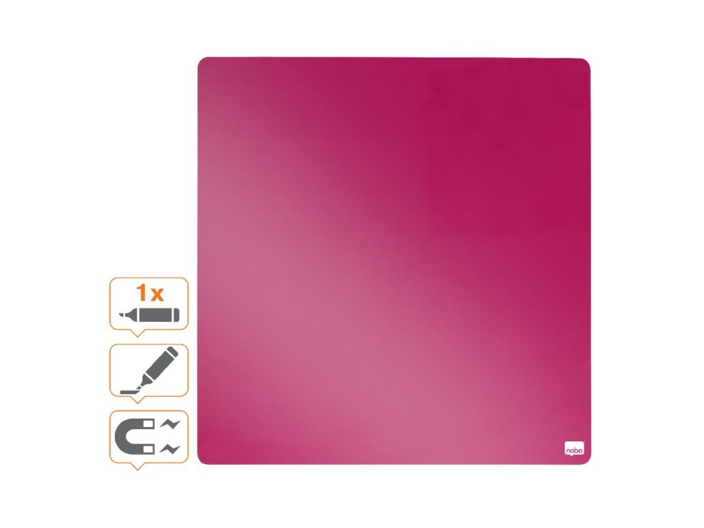 Magnetické, za sucha mazateľné tabule z bezrámčekových štvorcových dielcov Rexel. Obsahujú dva magnety, popisovač GlowWrite mazateľný za sucha, montážne magnety a penovú lepiacu pásku. Modulárny systém - dajú sa kombinovať navzájom alebo i s ostatnými nástenkami a popisovacími tabuľami Rexel. 360 × 360 mm. Farba ružová.Dodatočné parametre