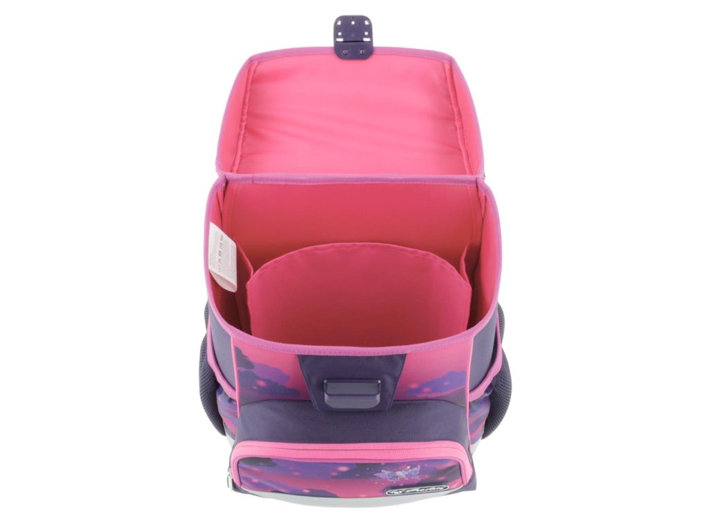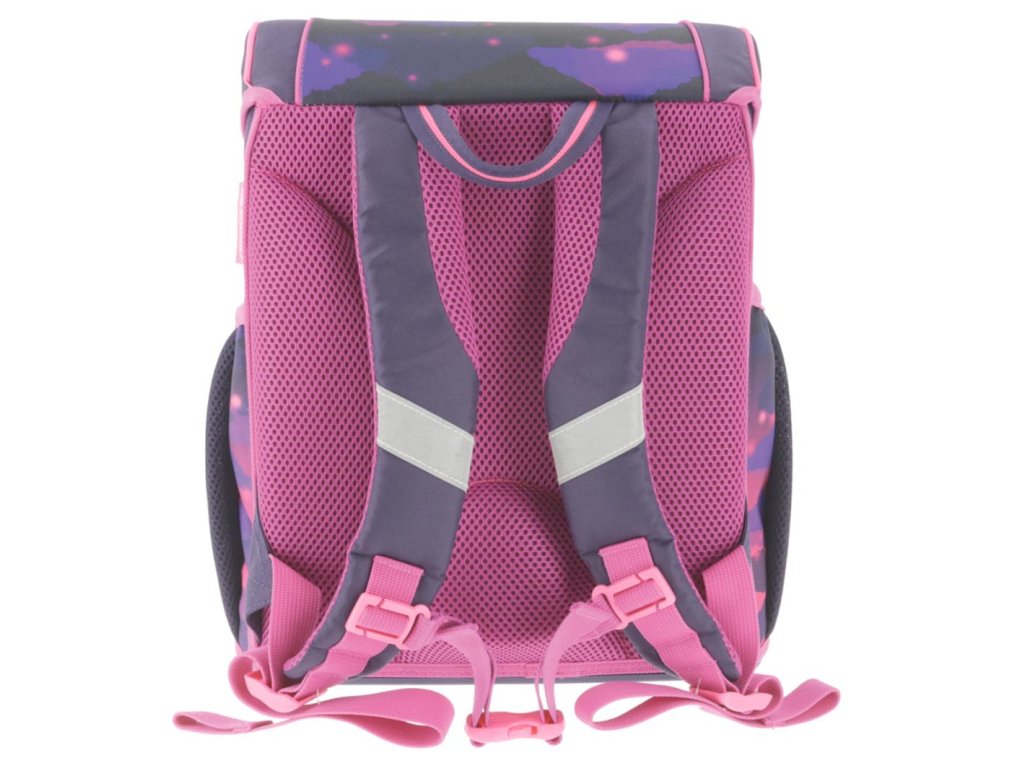 Školská taška s výbavou, ergonomicky tvarovaným a priedušným polstrovaním chrbta, nastaviteľnými ramennými popruhmi, výškovo nastaviteľným hrudným pásom, hlavným vreckom s priestorom na knihy, bočnými vreckami s elastickými pásikmi, predným vreckom na zips, stabilnou spodnou doskou s nožičkami, pohodlnou rukoväťou a reflexnými prvkami Oralite. Hmotnosť 950 g, objem 16 l, rozmery 37 x 31 x 22 cm. Vode-odolná, bez PVC, výbava: peračník, vrecko na prezuvky, okrúhle puzdro. Certifikát ergonómie 2023 a 2025. Materiál: polyester.Dodatočné parametre