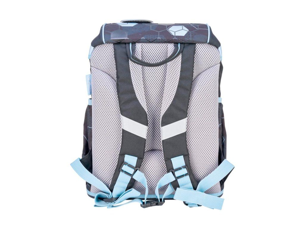 Školská taška s výbavou, s anatomicky tvarovaným polstrovaným a priedušným chrbtom, nastaviteľnými ramennými popruhmi, predným vreckom na zips, dvomi bočnými vreckami s elastickými pásikmi, stabilnou spodná doskou s nožičkami, pohodlnou rukoväťou, reflexnými prvkami Oralite, zatváranie Click lock zips, 1 x odnímateľný odznačik na suchý zips, 1 x dekoratívny prvok. Hmotnosť 800 g, objem 22 l, rozmery: 39 x 32 x 25 cm. Vode-odolná, bez PVC, výbava: peračník prázdny 2 chlopne, vrecko na prezuvky, oválne puzdro.Dodatočné parametre