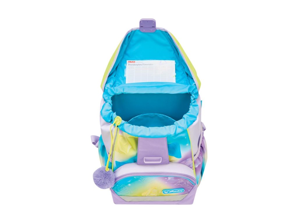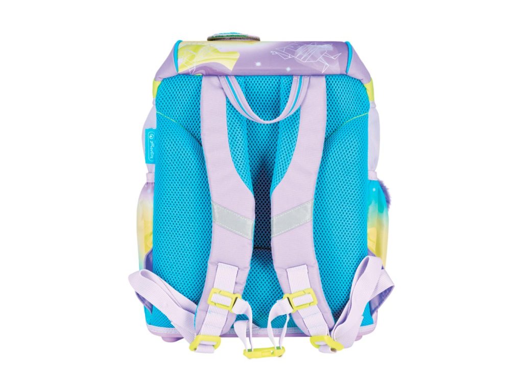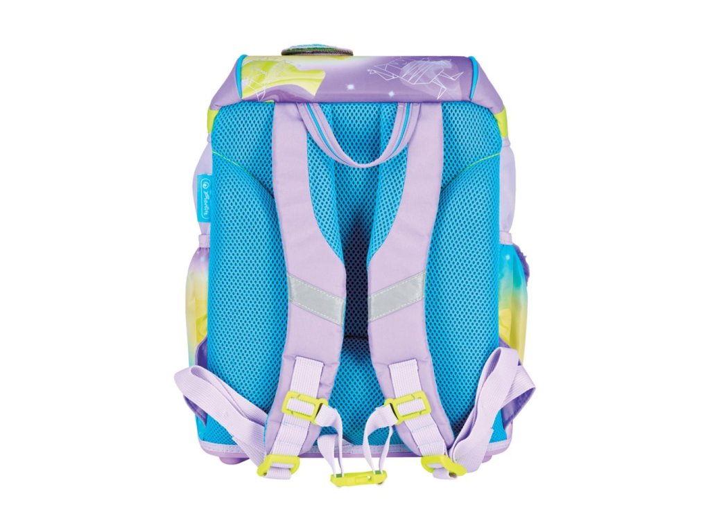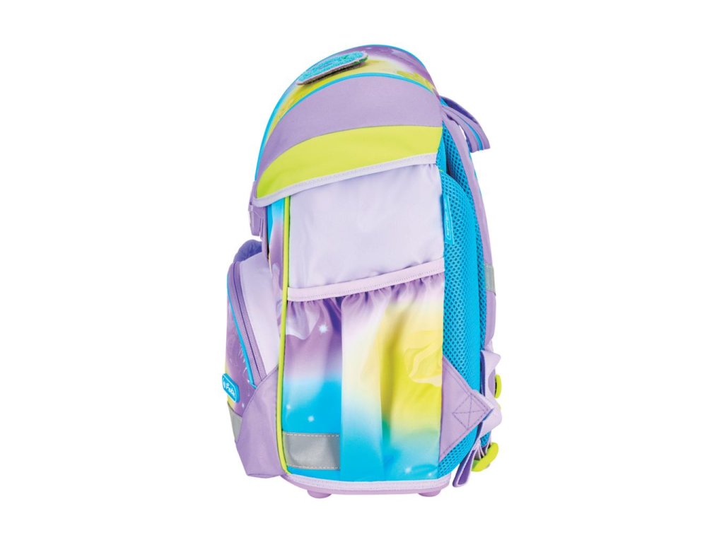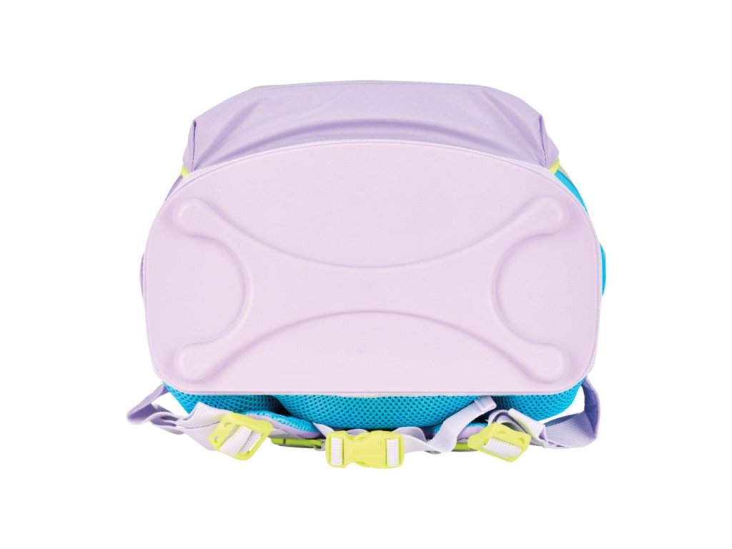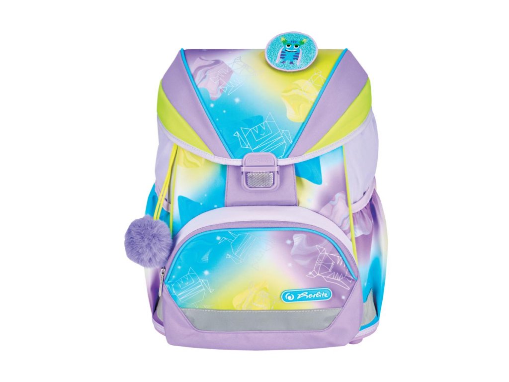 Školská taška s výbavou, s anatomicky tvarovaným polstrovaným a priedušným chrbtom, nastaviteľnými ramennými popruhmi, predným vreckom na zips, dvomi bočnými vreckami s elastickými pásikmi, stabilnou spodná doskou s nožičkami, pohodlnou rukoväťou, reflexnými prvkami Oralite, zatváranie Click lock zips, 1 x odnímateľný odznačik na suchý zips, 1 x dekoratívny prvok. Hmotnosť 800 g, objem 22 l, rozmery: 39 x 32 x 25 cm. Vode-odolná, bez PVC, výbava: peračník prázdny 2 chlopne, vrecko na prezuvky, oválne puzdro.Dodatočné parametre