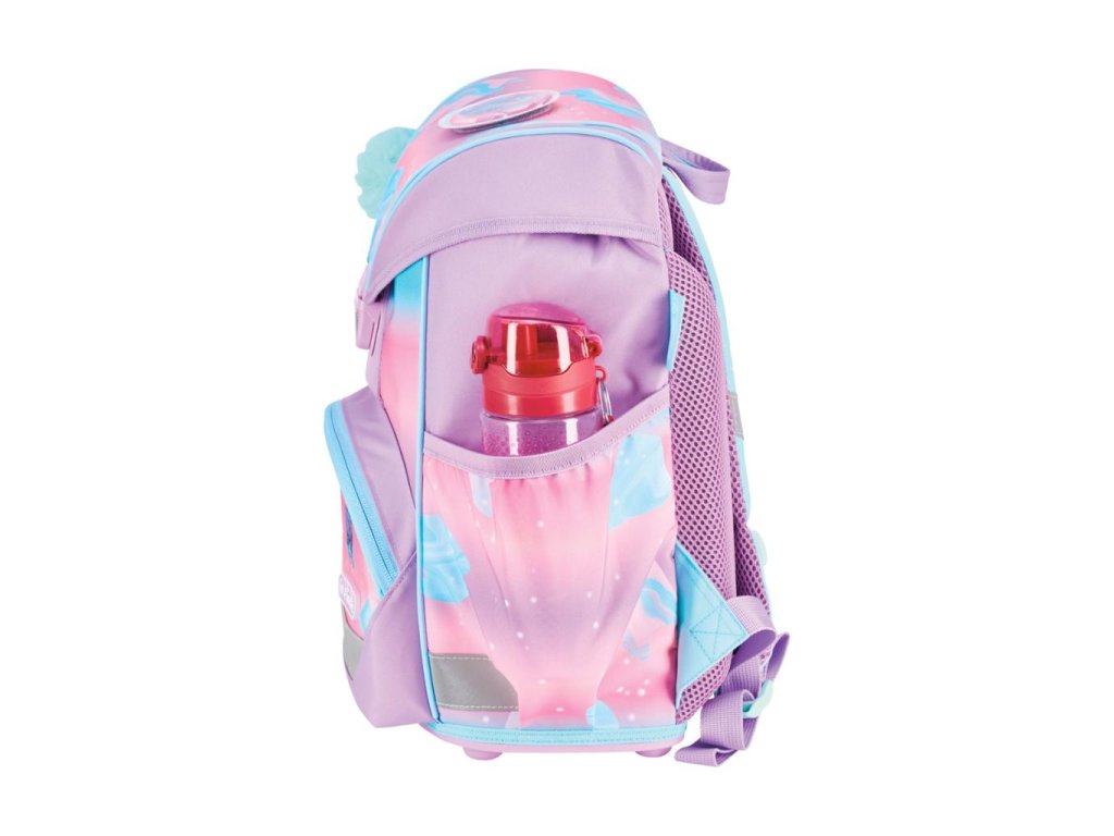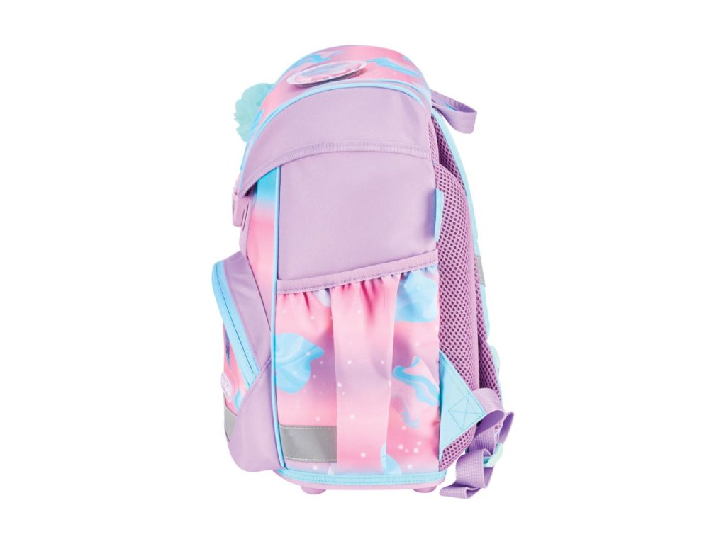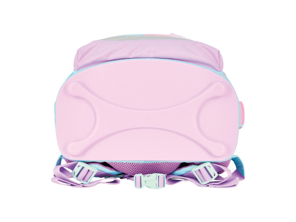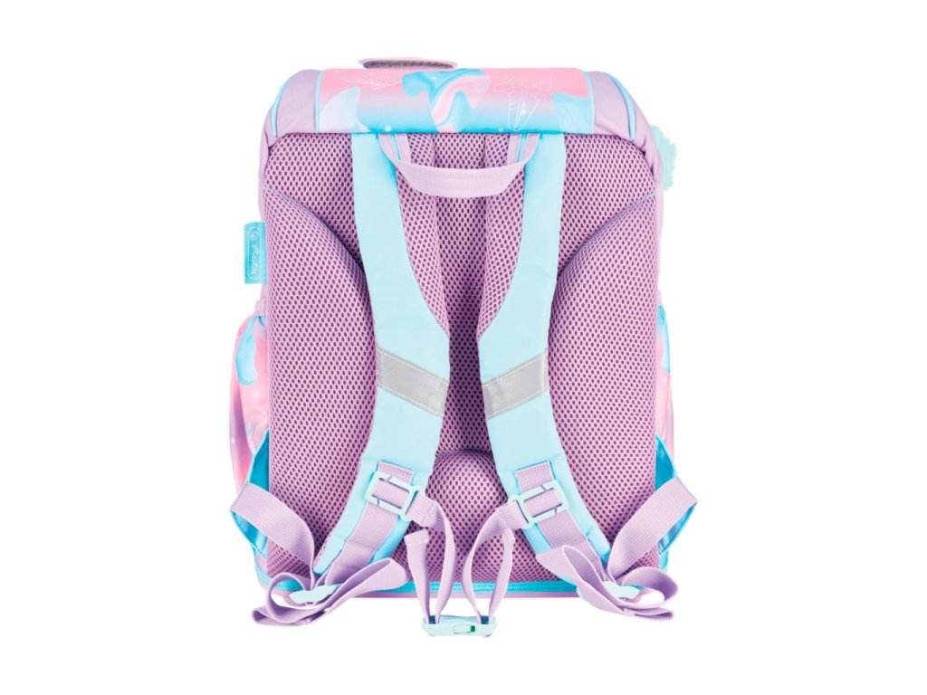 Školská taška bez výbavy, s anatomicky tvarovaným polstrovaným chrbtom, širokými nastaviteľnými ramennými popruhmi, hrudným popruhom, predným vreckom, dvomi bočnými vreckami, reflexnými prvkami Oralite, 1x aplikácia na suchý zips, 1 x dekoratívny prvok. Hmotnosť 750 g, objem 15 l, rozmery: 36 x 28 x 21 cm.Dodatočné parametre