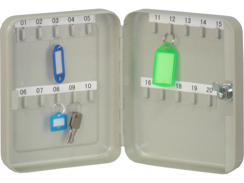 Uzamykateľná skrinka na 20 kľúčov, vyrobená z pevnej ocele. Súčasťou balenia sú 2 kľúče. Farba sivá. Rozmery 160 × 200 × 60 mm.Dodatočné parametre