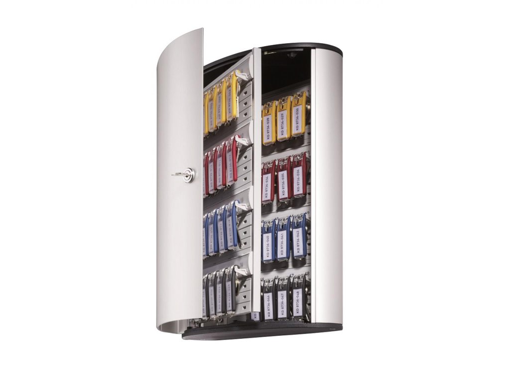 Veľká skrinka na 48 kľúčov s dvierkami, otvárajúcimi sa z dôvodu lepšej obsluhy v 180° uhle. Jednoduchá montáž na stenu. Súčasťou balenia je montážna sada, 2 bezpečnostné kľúče a 6 menoviek na kľúče v rôznych farbách. Farba strieborná.Výška: 40 cm