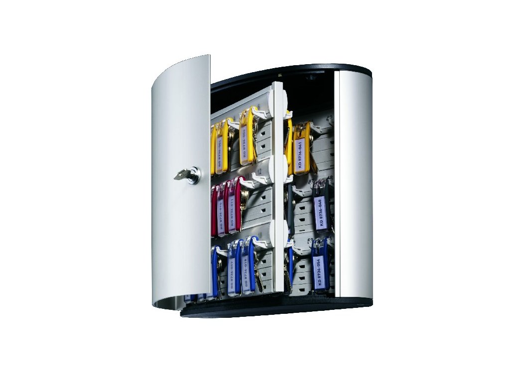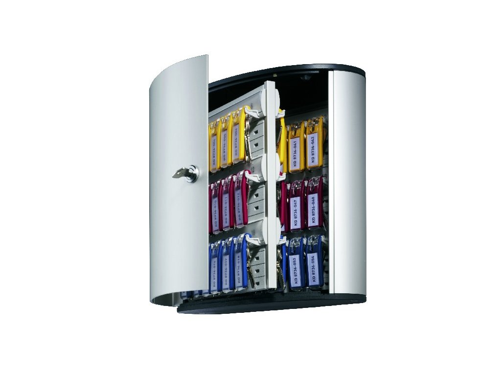 Skrinka na 54 kľúčov s dvierkami, otvárajúcimi sa z dôvodu lepšej obsluhy v 180° uhle. Jednoduchá montáž na stenu. Súčasťou balenia je montážna sada, 2 bezpečnostné kľúče a 6 menoviek na kľúče v rôznych farbách. Farba strieborná.Výška: 28 cm