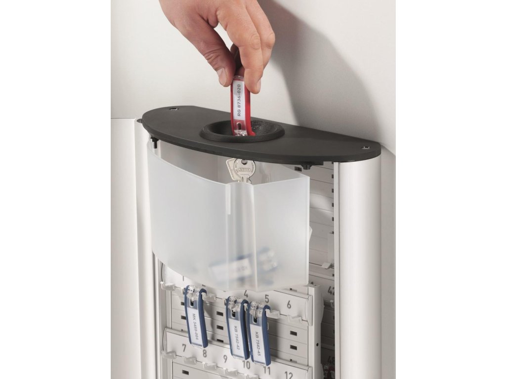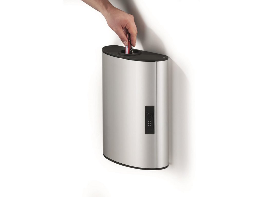Skrinka na kľúče so zámkom na číselný kód, s dvierkami, otvárajúcimi sa z dôvodu lepšej obsluhy v 180° uhle a vrchným otvorom na odovzdanie kľúča bez nutnosti otvorenia skrinky. Kapacita 54 kľúčov. Jednoduchá montáž na stenu. Súčasťou balenia je montážna sada a 6 menoviek na kľúče v rôznych farbách. Farba strieborná.Výška: 40 cm