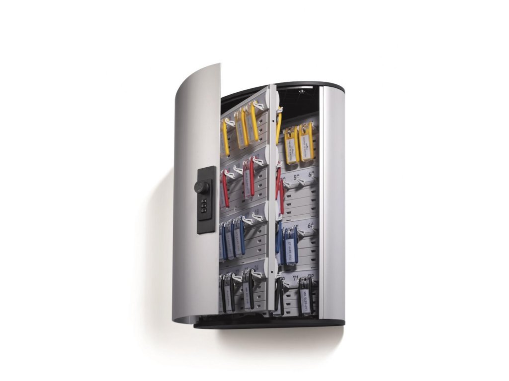Skrinka na 72 kľúčov so zámkom na číselný kód a dvierkami, otvárajúcimi sa z dôvodu lepšej obsluhy v 180° uhle. Jednoduchá montáž na stenu. Súčasťou balenia je montážna sada a 6 menoviek na kľúče v rôznych farbách. Farba strieborná.Výška: 40 cm