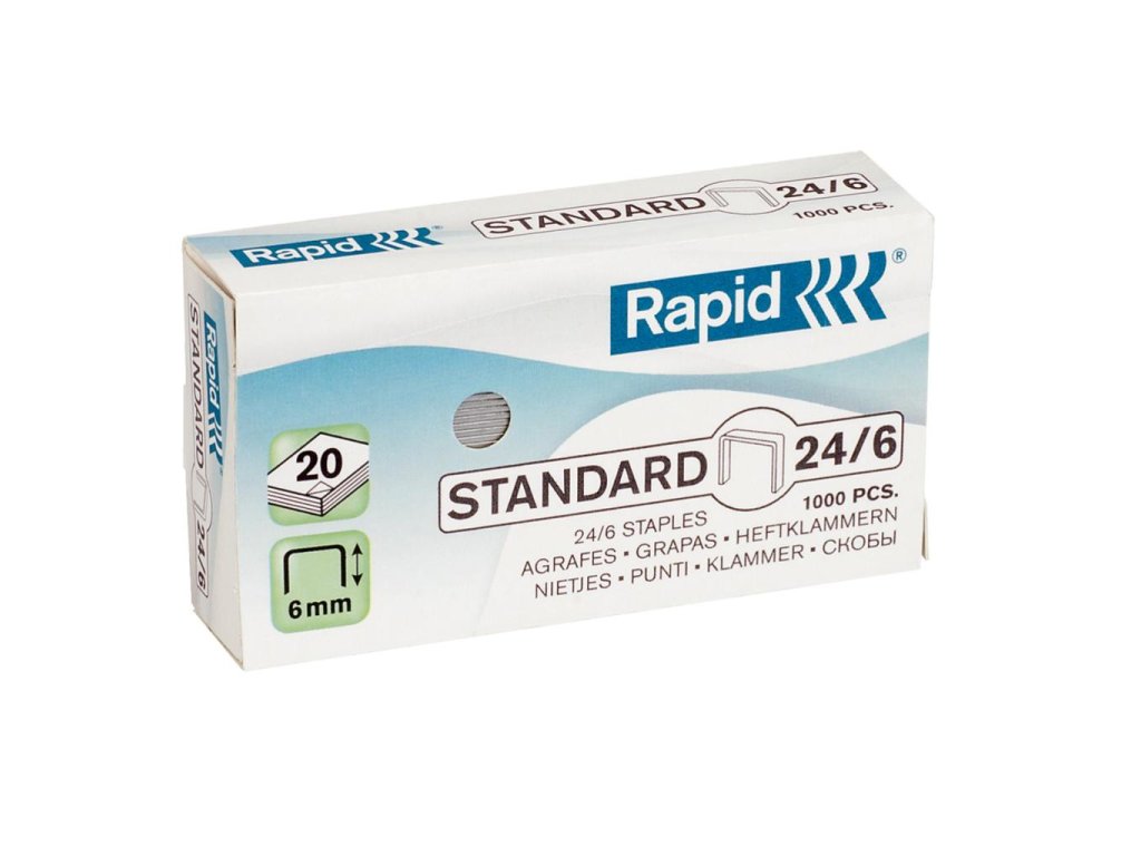 Zošívací výkon až 20 listov (80 g/m2). Krabička obsahuje: 1.000 spiniek. Rozlišovací systém typov spiniek pomocou farieb (STANDARD = Zelená). Dĺžka nožičky spinky 6 mm. Galvanizovaný mäkký drát pre maximálne pohodlné používanie. Ostré konce pre maximálnu penetráciu.Dodatočné parametre