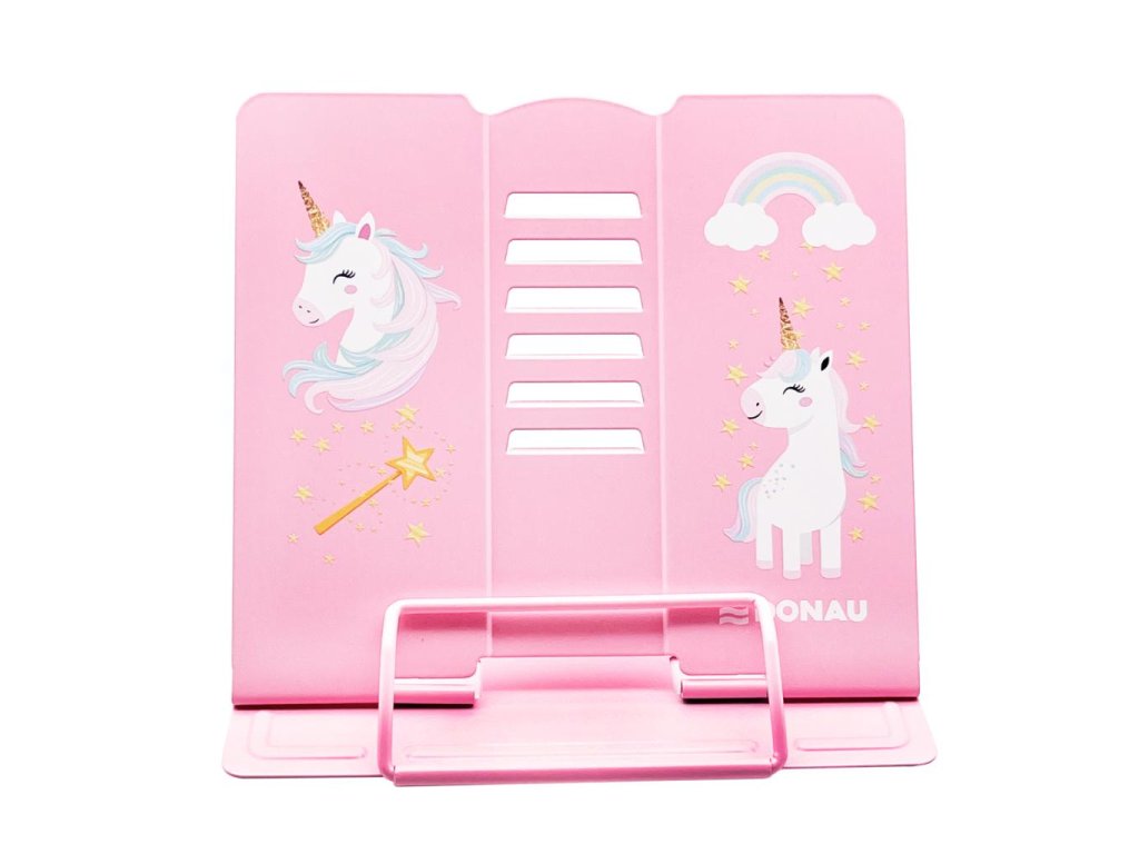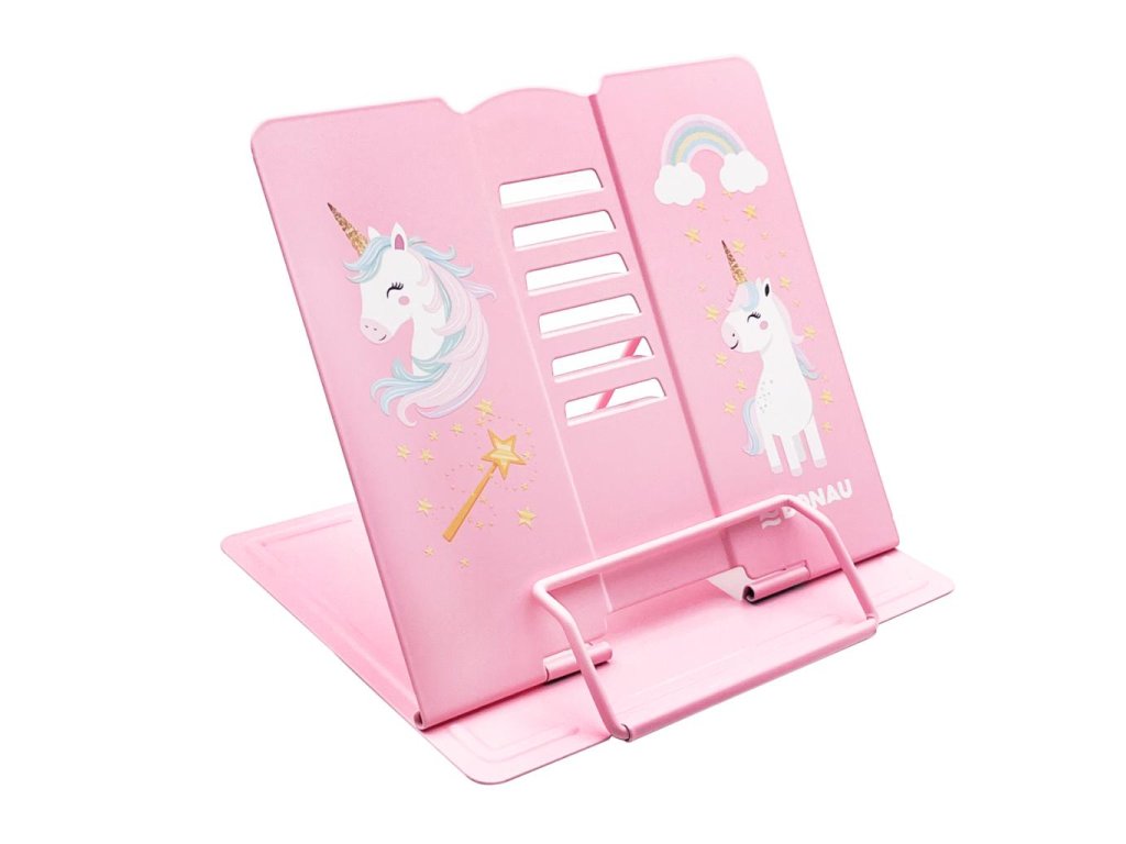 Kvalitný stojan na knihy, učebnice alebo tablet s atraktívnou potlačou Jednorožec. Vyrobený z odolného lakovaného kovu, ideálny aj pre ťažšie knihy. S protišmykovými úchytmi, nastaviteľná výška a uhol sklonu v 5 stupňoch. Keď sa nepoužíva, zloží sa úplne naplocho. Súčasťou je aj praktická zarážka na otvorenú stránku. Využitie nájde doma, v škole, v kuchyni, v kancelárii či ako stojan na noty. Rozmery: základňa: 21 × 16,5 cm, výška: 15,7 cm.Výška: 15,7 cm