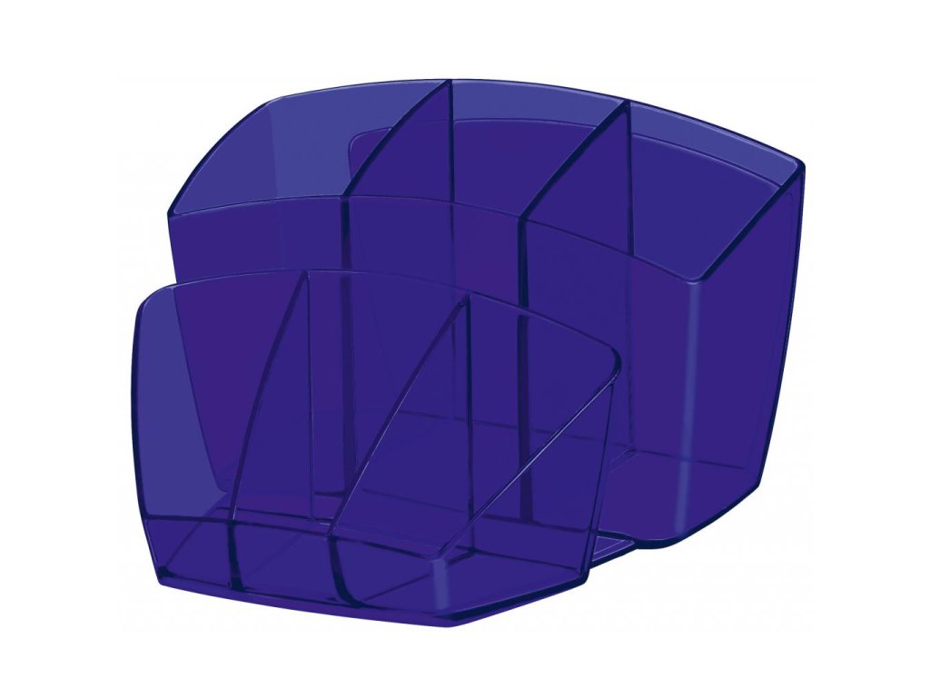 Dômyselne navrhnutý kompaktný a elegantný stolný organizér na kancelárske príslušenstvo. Kapacita: 40 pier, 5 zvýrazňovačov a 3 všeobecné priehradky. Na spodnej časti protišmyková podložka. Celkové rozmery 143 × 158 × 93 mm. 100% recyklovateľný, vysokokvalitný plast. Väčšie balenie 6 ks. Farba transparentná modrá.Dodatočné parametre