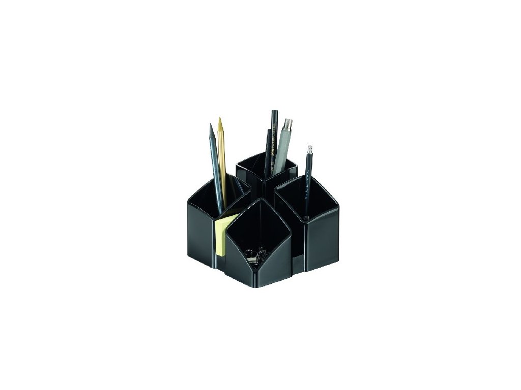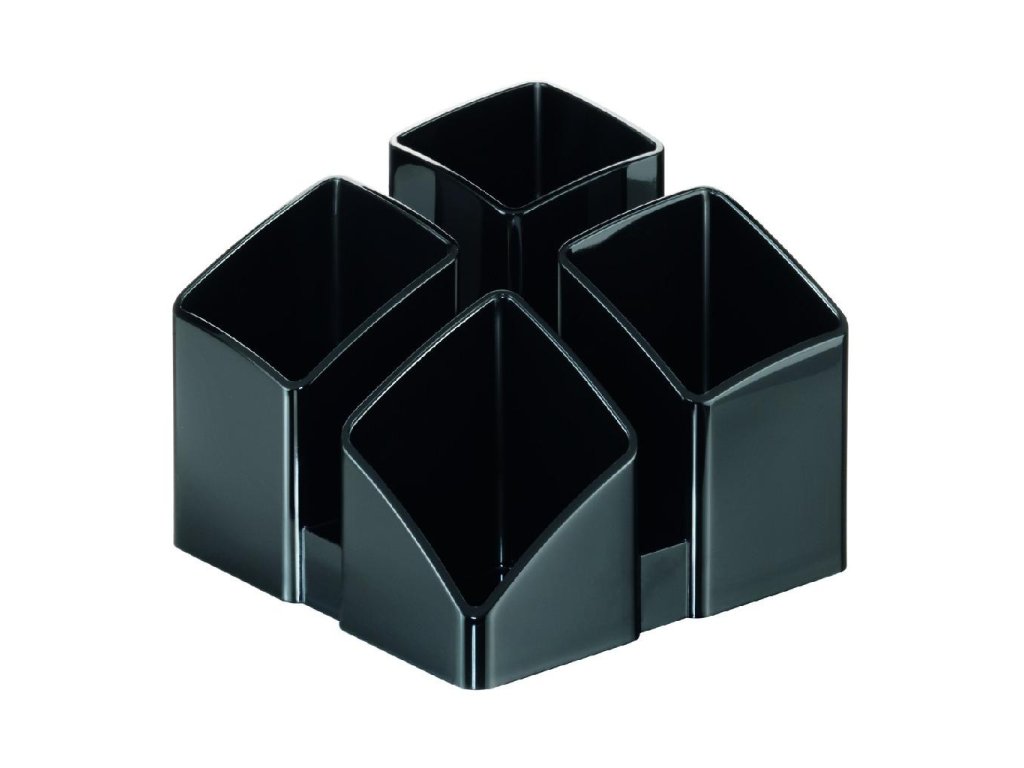 Stojan so 4 sekciami na písacie potreby a ďalšie kancelárske drobnosti. Spodná strana s protišmykovou úpravou. Materiál kvalitný plast vysokého lesku. Pri spojení 2 alebo 4 stojanov dosiahnete zaujímový moderný efekt. Rozmery 125 × 125 × 100 mm. Stojan dodávaný prázdny.Farba: čierna