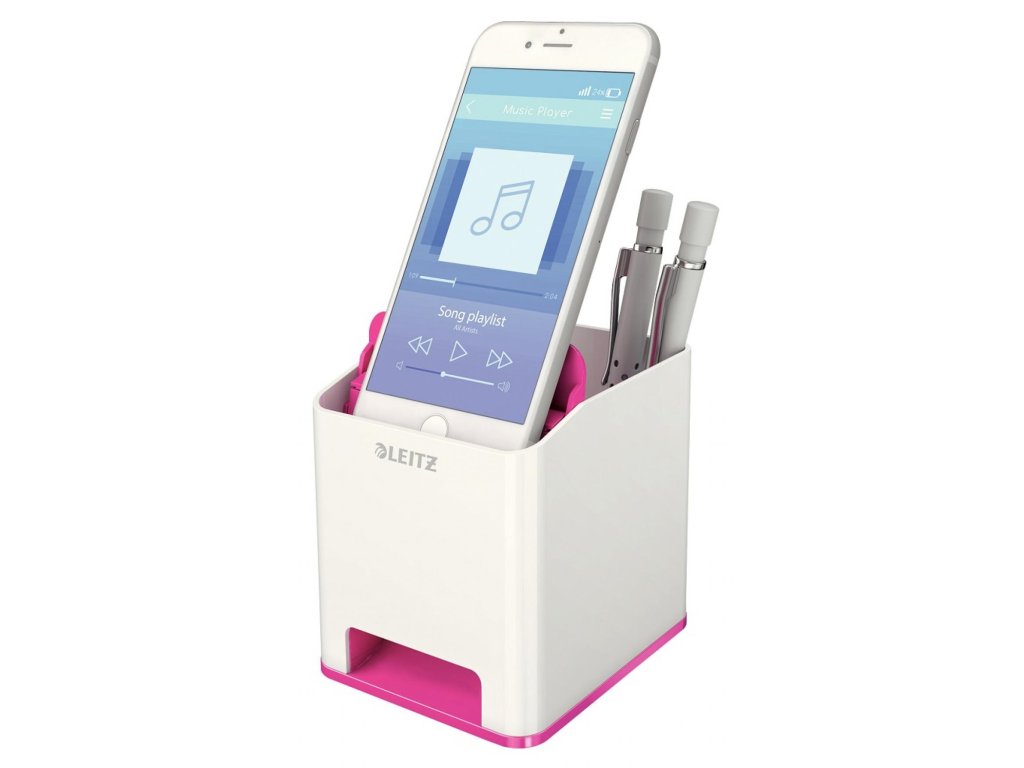 Neprehliadnuteľný štýlový stojan na perá v prémiovej kvalite Leitz v štýlových žiarivých farbách WOW. Extra odkladač pre smartphone do veľkosti iPhone 6 plus so špeciálnou funkciou pre zosilovanie zvuku, veľa miesta pre písacie potreby, pravítko, stylus a iné drobnosti. Moderný dizajn, ktorý vyzerá rovnako dobre v kancelárii, ako aj doma na pracovnom stole, dobre dopĺňa ostatné produkty radu WOW.Dodatočné parametre