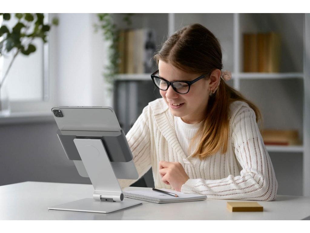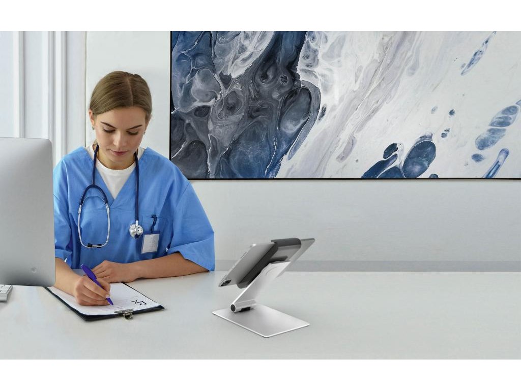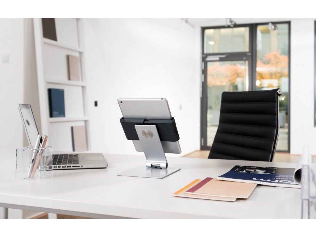 Rotačný stojan 360 ° na stôl na tablety od 7 do 13 ` na výšku alebo na šírku s jednoduchým vkladaním a vyberaním tabletu. Uchytávacie body po 90 °, ochrana pred bočným vybratím tabletu, premenlivý uhol sklonu ramena od 0 ° do + 88 °, symetrické otváranie držiaka od 160 do 275 mm. Otvor v stojane slúži ako výstup pre nabíjací kábel. Uzamknutie držiaka pomocou špeciálneho kľúča. Materiál hliník, ASB a oceľový plech. Dodatočná ochrana proti krádeži pomocou káblového zámku (nie je súčasťou balenia). Rozmery 155 × 242 × 183 mm.Dodatočné parametre
