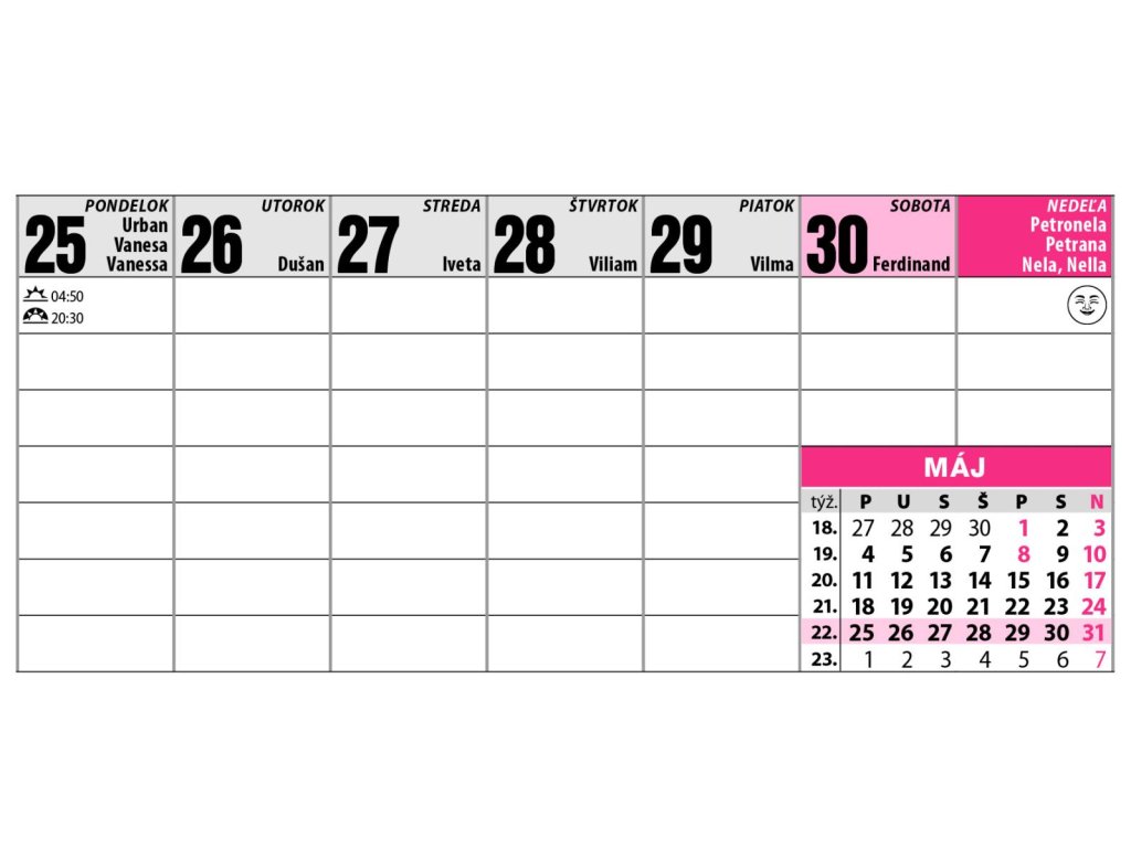 Tento týždenný stĺpcový kalendár ocenia najmä seniori a ľudia so zhoršeným zrakom. Veľké, ľahko čitateľné písmo zaručuje pohodlné používanie bez námahy. Obsahuje tabuľku prázdnin, slovenský menný kalendár a priestor na poznámky. Ideálny pomocník do domácnosti alebo kancelárie.Formát: 297 x 138