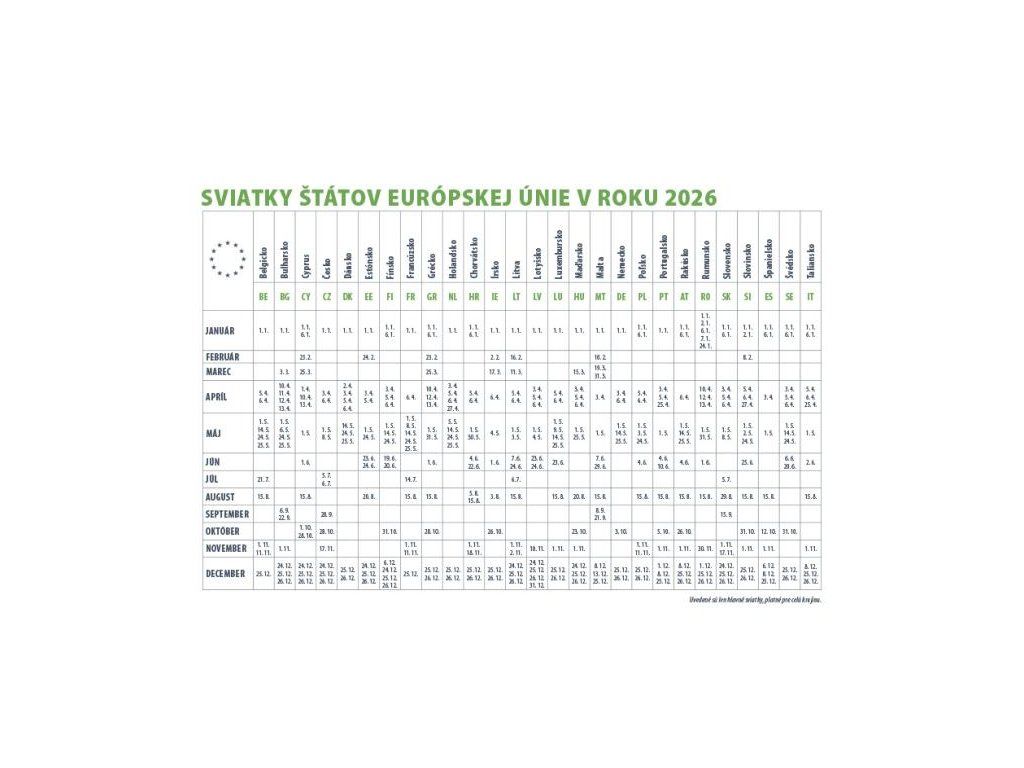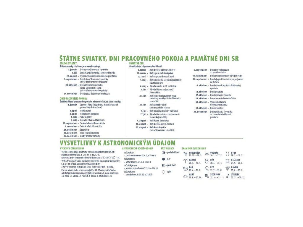 Variant pracovného kalendára s riadkovým kalendáriom. Obsah je identický s veľkým pracovným kalendárom, vrátane daňových pripomienok s prehľadnými mesačnými kalendáriami, fázami Mesiaca, východmi a západmi Slnka, štátnymi sviatkami všetkých krajín EÚ, školskými prázdninami, znameniami zverokruhu, slovenskými a českými menami (plus netradičné mená).Formát: 210 × 150 mm.