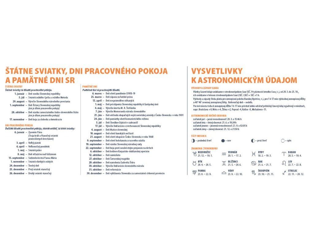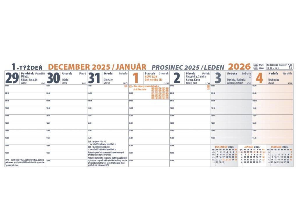 Najpredávanejší stolový kalendár, veľmi prehľadný, vhodný pre aktívnych ľudí. Obsahuje dostatočný priestor na poznámky a všetky potrebné informácie pre každý pracovný deň. Týždňový stĺpcový kalendár s hodinovým delením, daňovými pripomienkami, mesačnými kalendáriami, fázami Mesiaca, východmi, západmi Slnka, štátnymi sviatkami krajín EÚ, školskými prázdninami, znameniami zverokruhu, slovenskými a českými menami (plus netradičné mená).Formát: 300 × 120 mm