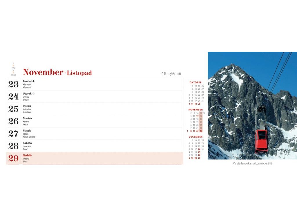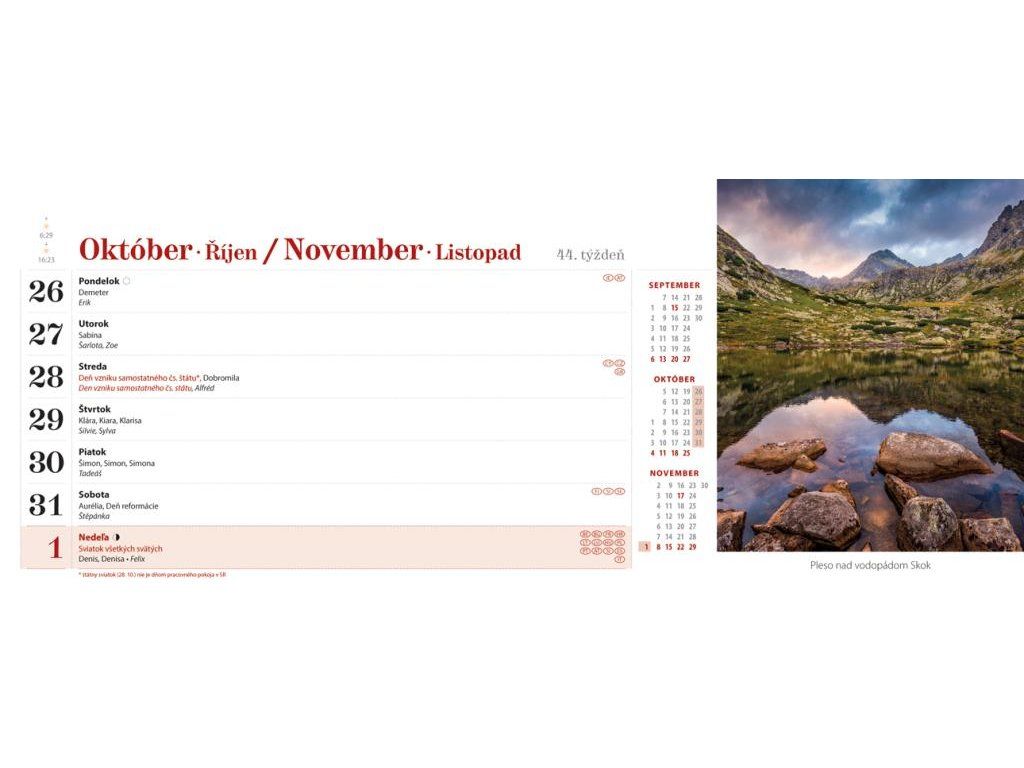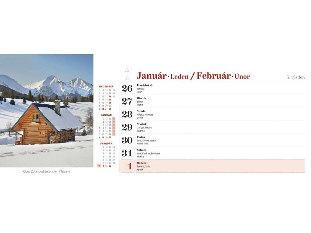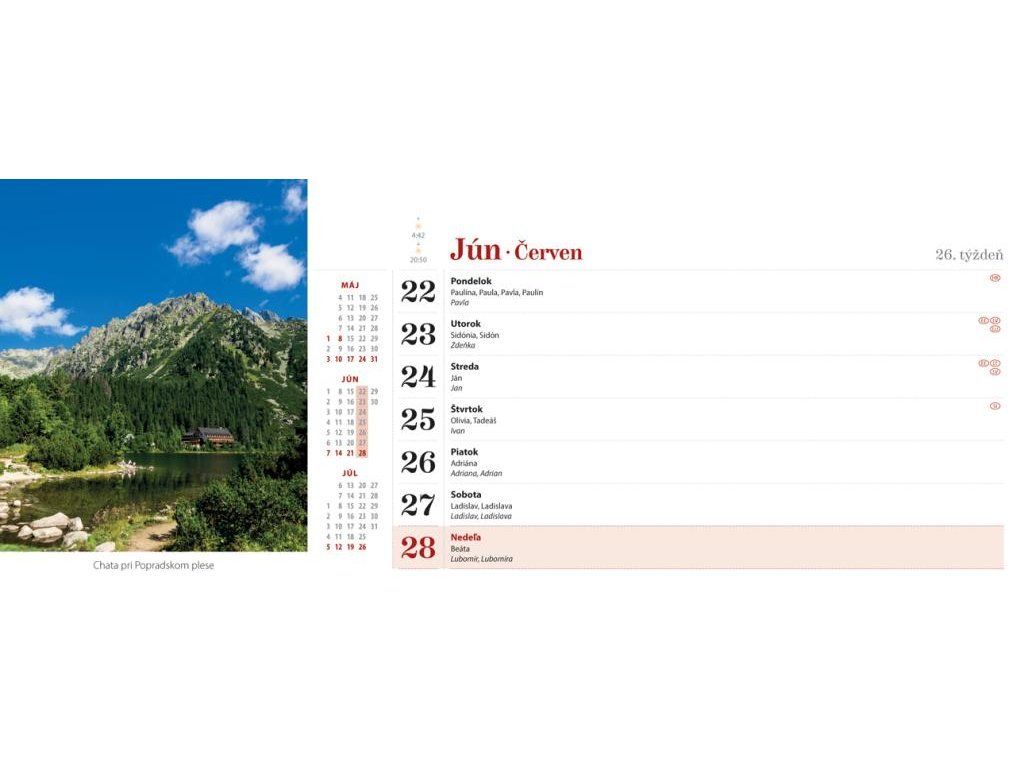 Tatranské štíty, príroda a ľudia, zachytené v stolovom týždňovom kalendári s riadkovým delením, daňovými pripomienkami, fázami Mesiaca, východmi a západmi Slnka, štátnymi sviatkami všetkých krajín EÚ, školskými prázdninami, slovenskými a českými menami (plus netradičné mená).Formát: 300 × 120 mm