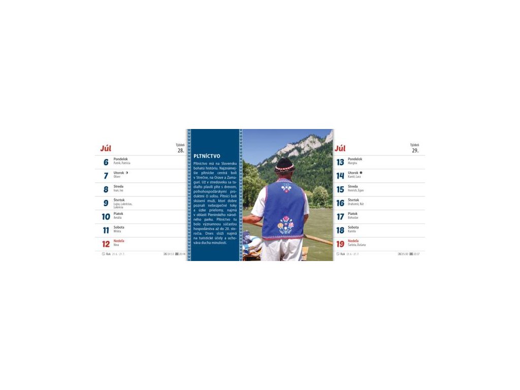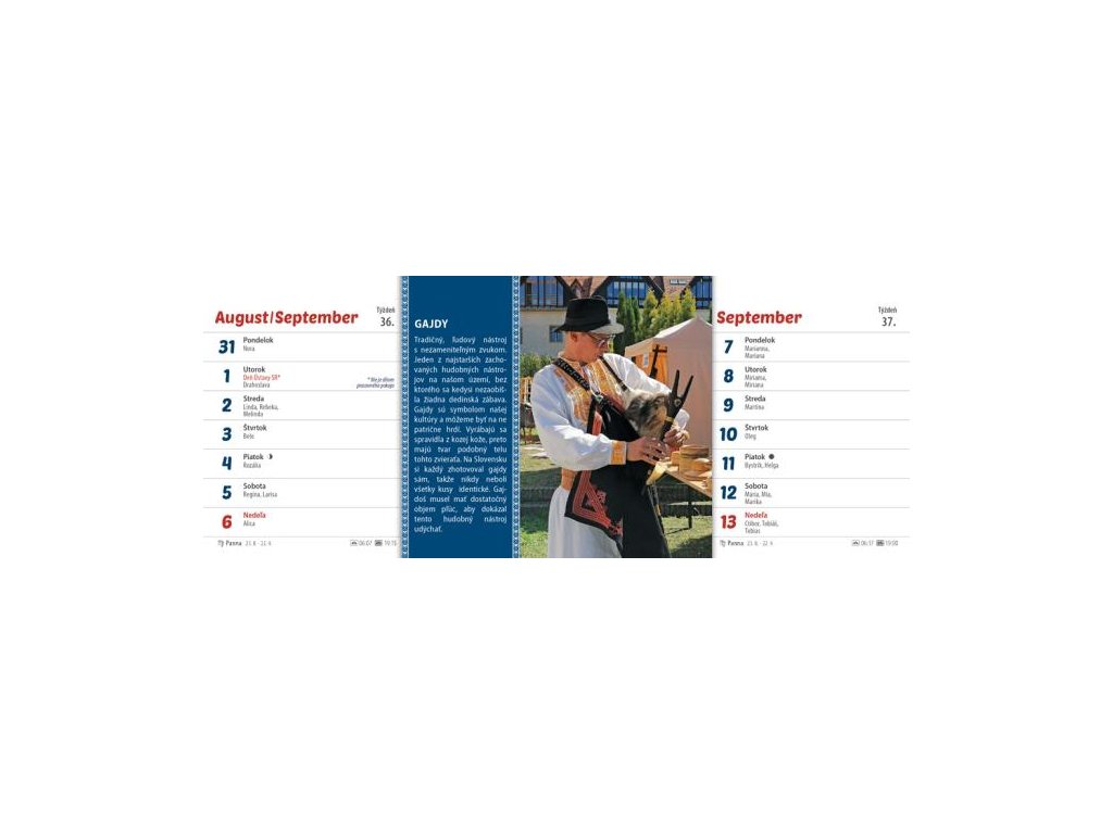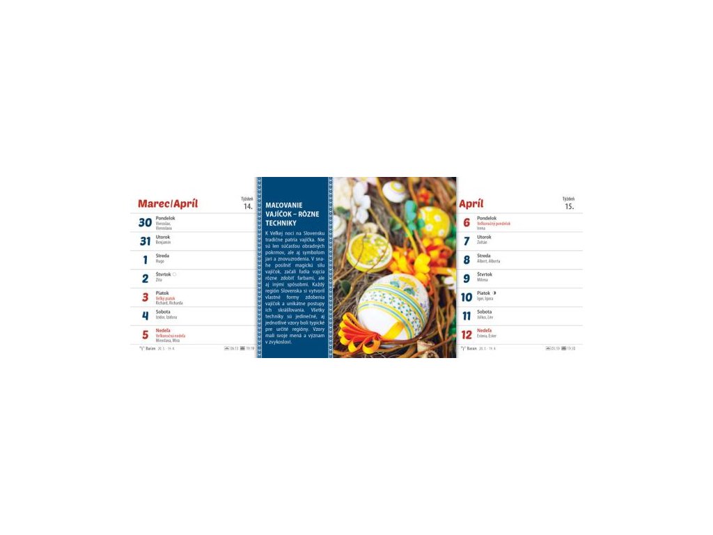 Ľudové zvyky a tradície sú naším národným pokladom. Zdedili sme ich po našich predkoch a mali by byť uchovávané z generácie na generáciu. Aby neostali zabudnuté, pripomíname si ich v originálnom rýdzo slovenskom kalendári Zvyky a tradície na Slovensku. Obsahuje dvojtýždňové riadkové kalendárium so slovenskými menami a sviatkami, východy a západy Slnka, fázy Mesiaca.Formát: 300 × 120 mm