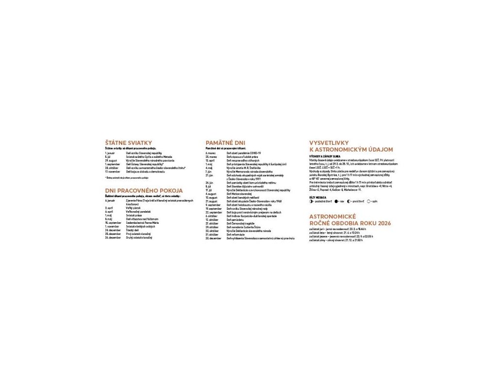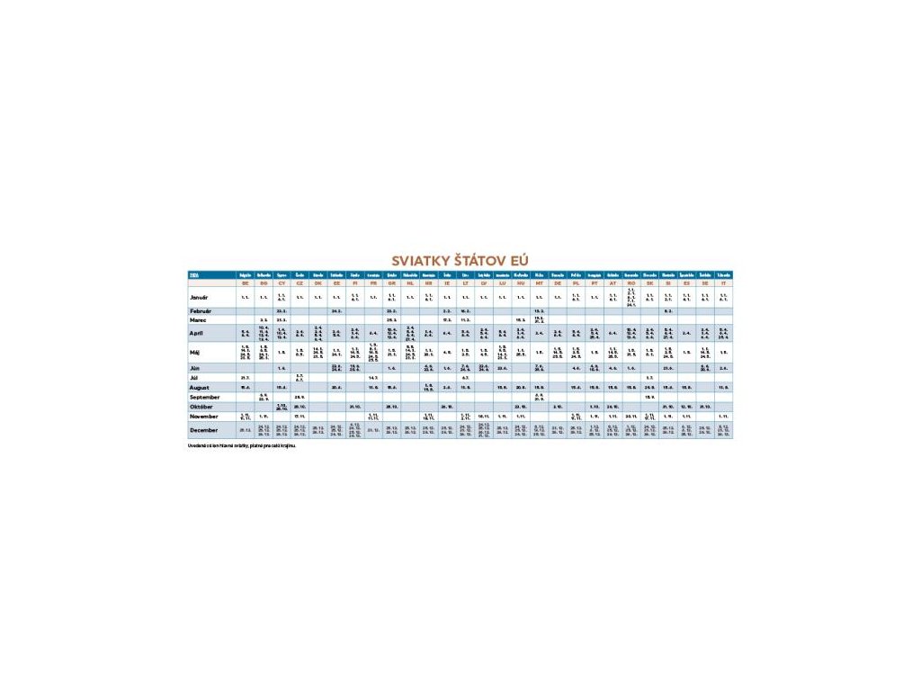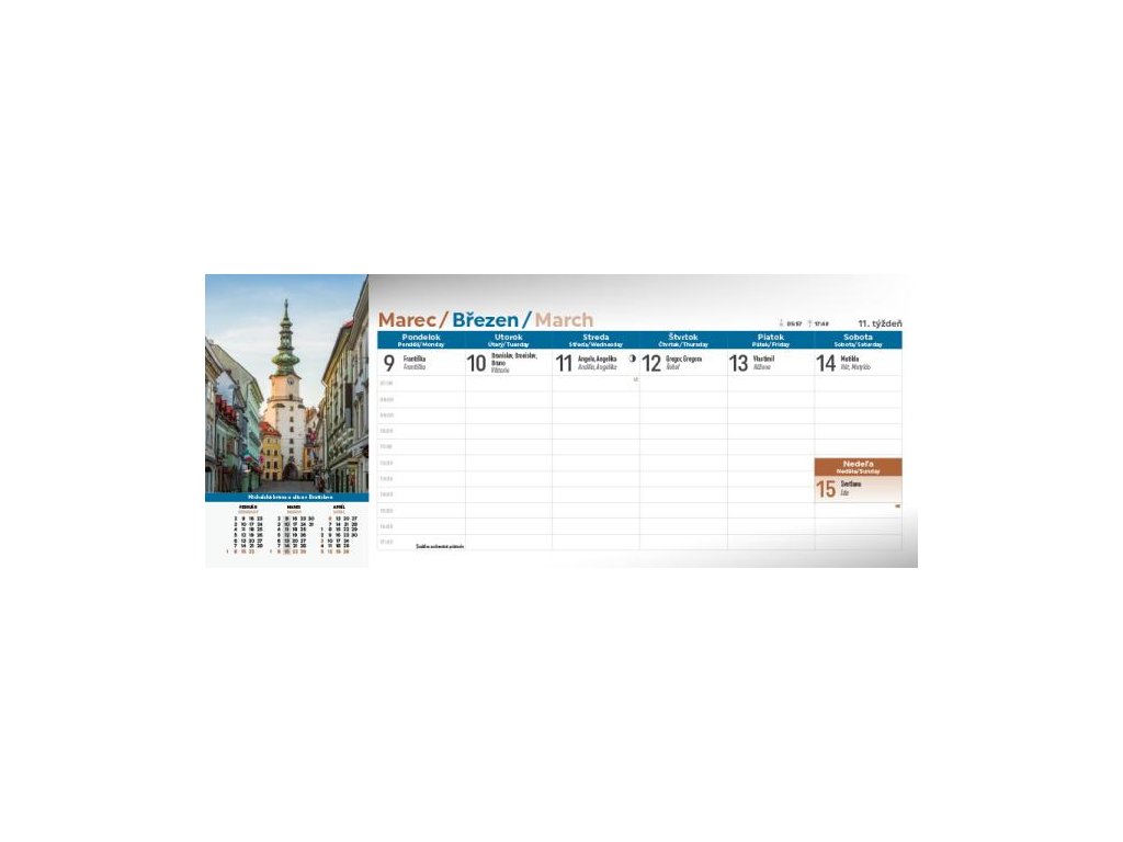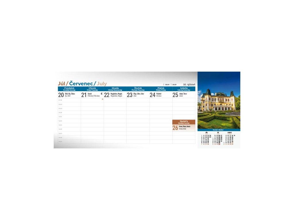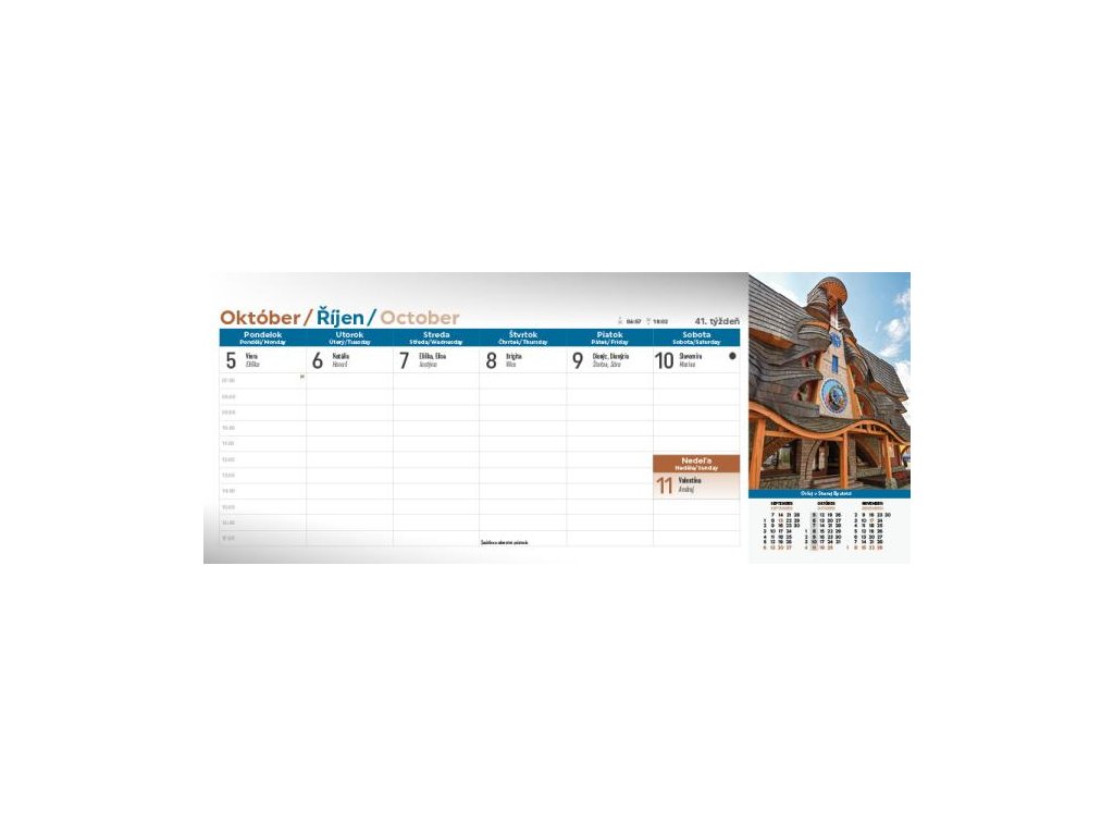 Spoznajte krásy Slovenska prostredníctvom stolového kalendára Slovensko. Týždňový stĺpcový kalendár s hodinovým delením, daňovými pripomienkami, fázami Mesiaca, východmi a západmi Slnka, štátnymi sviatkami všetkých krajín EÚ, školskými prázdninami, slovenskými a českými menami (plus netradičné mená).Formát: 300 × 120 mm