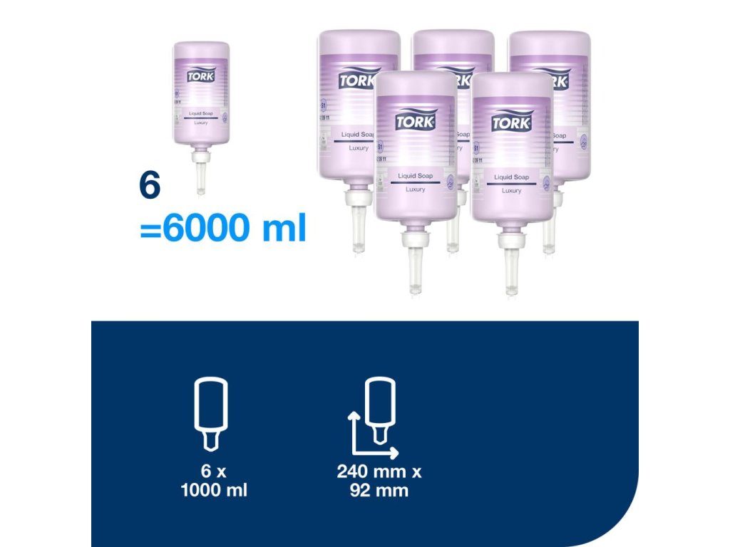 Jednorazová náplň luxusného tekutého mydla vhodná do dávkovačov TORK, ktoré sú overené ako ľahko používateľné a všetkým užívateľom poskytujú správnu hygienu rúk. Doprajte návšteve sviežu jazmínovú vôňu Tork. Výnimočné zloženie s jedinečnou vôňou a bohatými odtieňmi orgovánu obsahuje tiež výťažok z hodvábu, ktorý zanechá na vašej pokožke pocit jemnosti. Luxusná jazmínová vôňa, obsahuje 1 000 dávok. Objem 1000 ml.