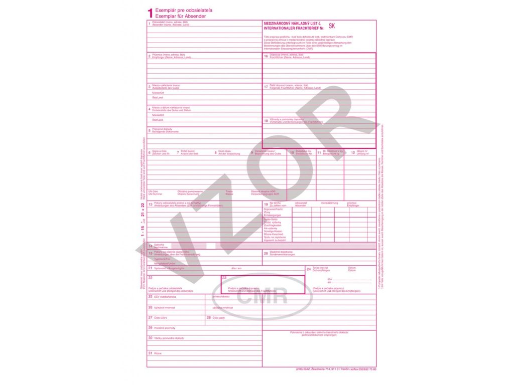 Evidenčné a colné tlačivá. CMR, 7 listov, balenie 100 súp. Samoprepis.