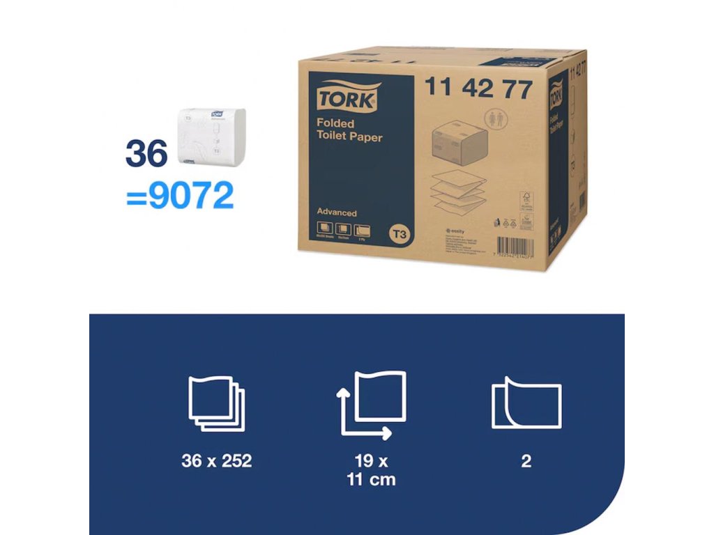 Systém Tork Folded skladaný toaletný papier ponúka hygienické dávkovanie po útržkoch, čo znižuje odpad a náklady na údržbu. Tork Folded toaletný papier Advanced výborne vyvažuje náklady a výkon. Tento systém je ideálny pre stredne frekventované prostredia.Šírka ústrižku: 11 cm