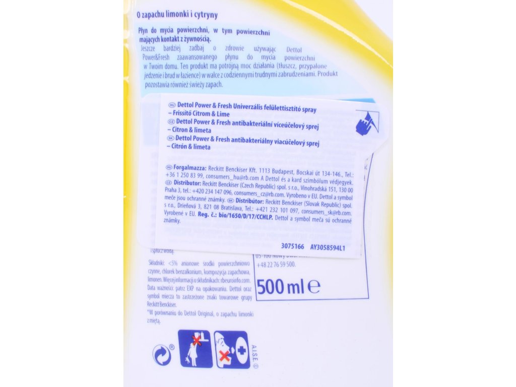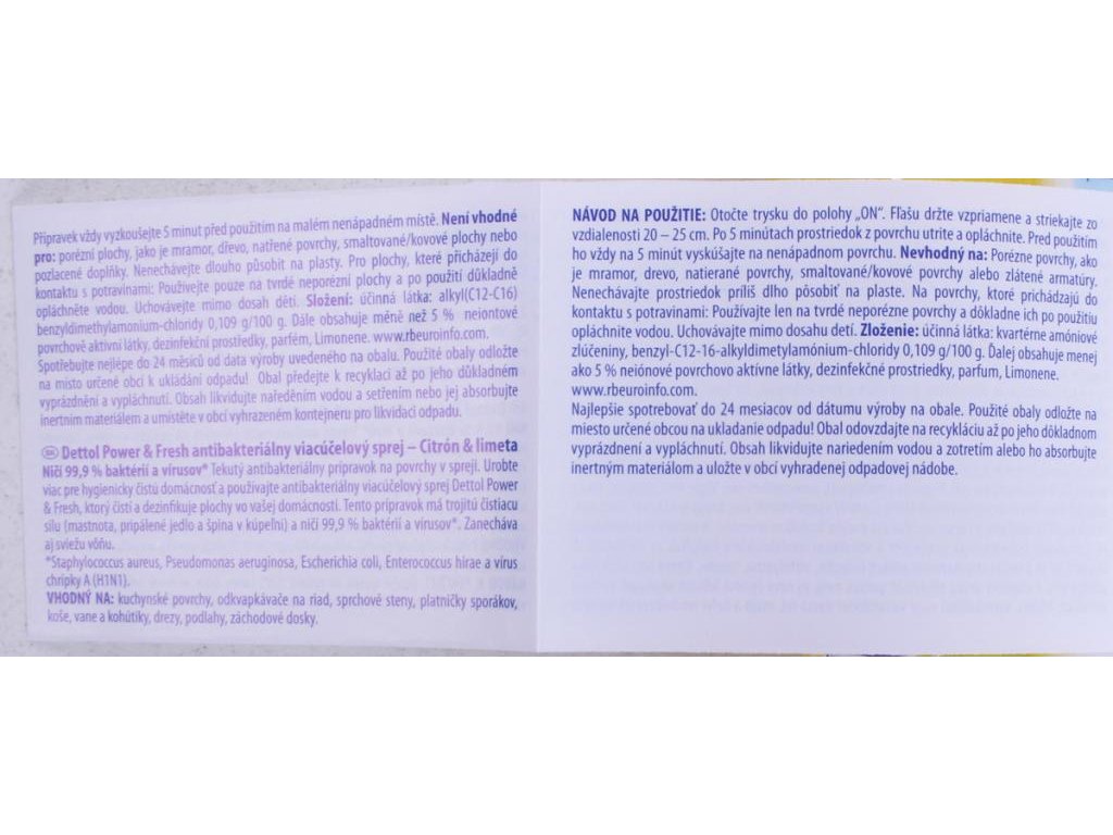 Dettol antibakteriálny sprej na povrchy s vôňou limetky je vhodný na väčšinu povrchov. Ničí 99,9 % baktérií a vírusov. Zároveň odstraňuje 90 % rôznych druhov alergénov, ktoré sa v domácnosti vyskytujú. Jednoducho nastriekate a utriete bez oplachovania. Pre hygienicky čistú domácnosť.Zloženie: