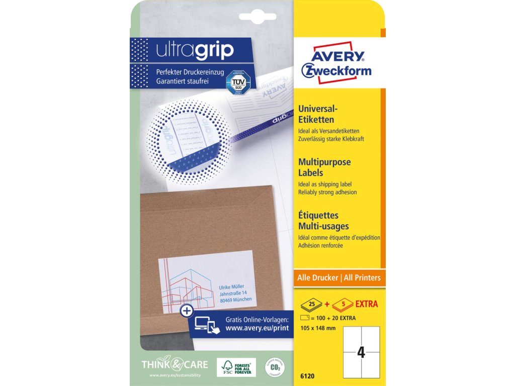 Biele univerzálne etikety vhodné na každodenné použitie v atramentových a laserových tlačiarňach a kopírovacích strojoch. Vďaka inovatívnej technológie ultragrip sa môžete spoľahnúť na bezchybné natiahnutie archu a tlač bez zasekávania. Bezpečnostný okraj QCT zabraňuje zanášaniu tlačiarne lepidlom. Pre laserové tlačiarne testovanéa certifi kované TÜV SÜD. Vysoká lepivosť na rôznych povrchoch. Ostrá tlač bez bez rozmazávania. Etikety sú vyrobené spôsobom šetrným k životnému prostrediu, majú certifi káciu FSC®, sú bielené bez použitia chlóru. Šablóny a softvér pre jednoduchú a rýchlu tlač etikiet k dispozícii zdarma. Formát A4. Balenie 25 + 5 hárkov.