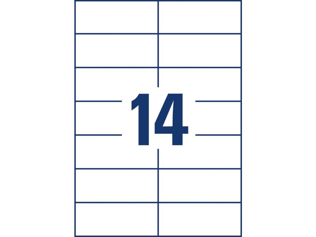 Biele univerzálne etikety vhodné na každodenné použitie v atramentových a laserových tlačiarňach a kopírovacích strojoch. Vďaka inovatívnej technológie ultragrip sa môžete spoľahnúť na bezchybné natiahnutie archu a tlač bez zasekávania. Bezpečnostný okraj QCT zabraňuje zanášaniu tlačiarne lepidlom. Pre laserové tlačiarne testované a certifi kované TÜV SÜD. Vysoká lepivosť na rôznych povrchoch. Ostrá tlač bez bez rozmazávania. Etikety sú vyrobené spôsobom šetrným k životnému prostrediu, majú certifi káciu FSC®, sú bielené bez použitia chlóru. Šablóny a softvér pre jednoduchú a rýchlu tlač etikiet k dispozícii zdarma. U niektorých rozmerov systém QuickPEEL™ na rýchlejšie odlepenie etikiet. Formát A4. Balenie 100 hárkov.Etikiet na hárku: 14