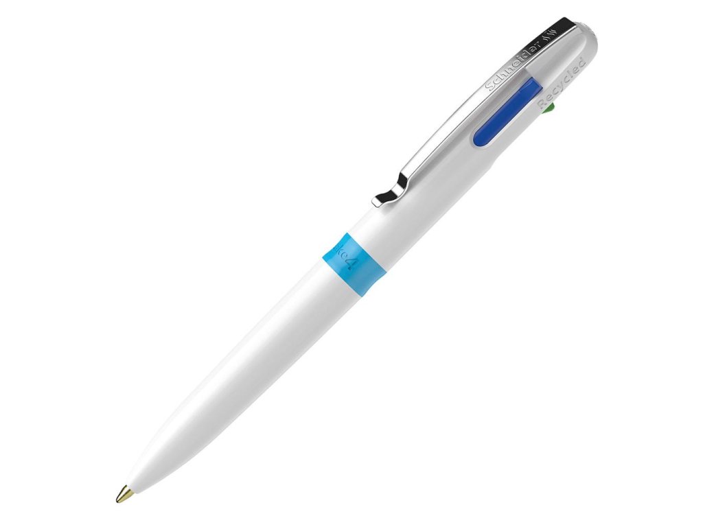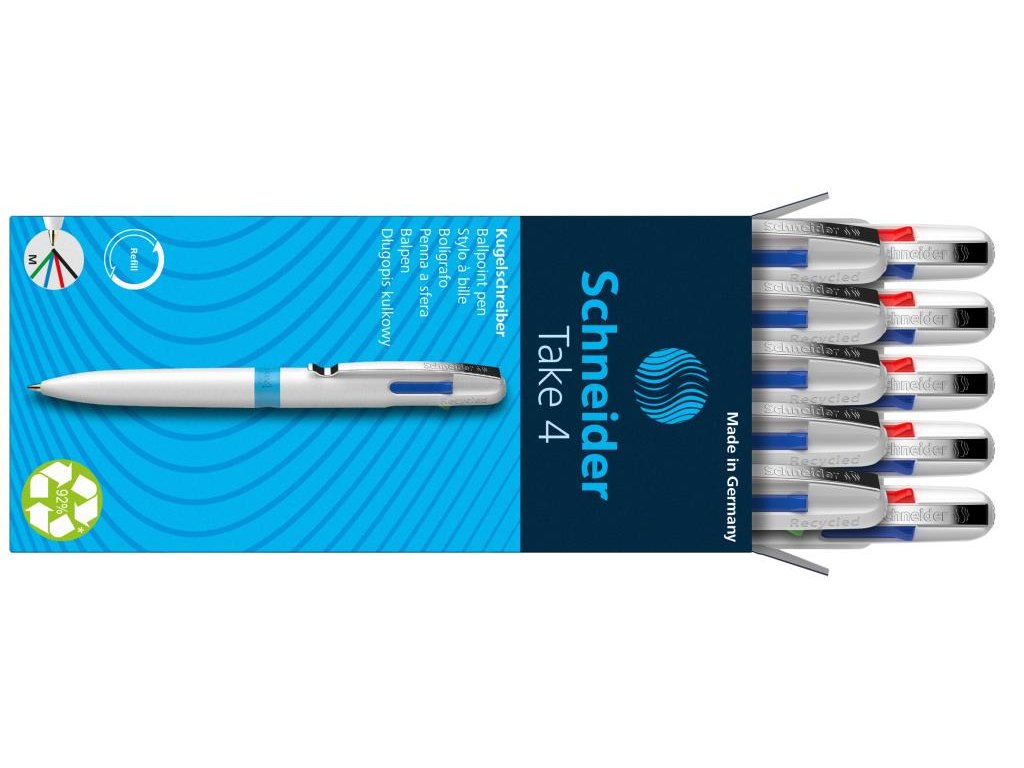 Štvorfarebné guľôčkové pero Schneider Take 4 s Viscoglide® technológiou pre hladké a kĺzavé písanie. Farba biela.unikátne guľôčkové pero vyrobené z 92 % z recyklovaných plastov