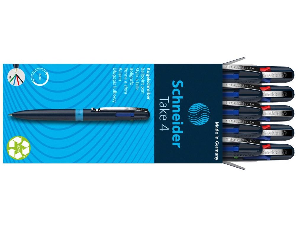 Štvorfarebné guľôčkové pero Schneider Take 4 s Viscoglide® technológiou pre hladké a kĺzavé písanieunikátne guľôčkové pero vyrobené z 92 % z recyklovaných plastov