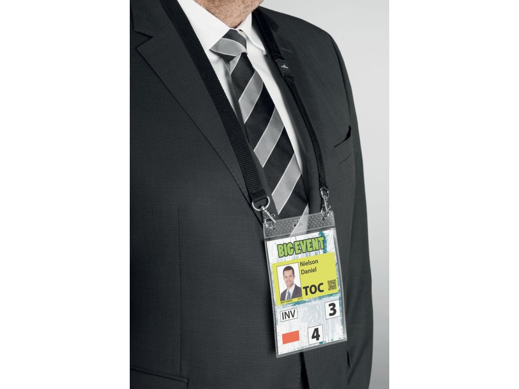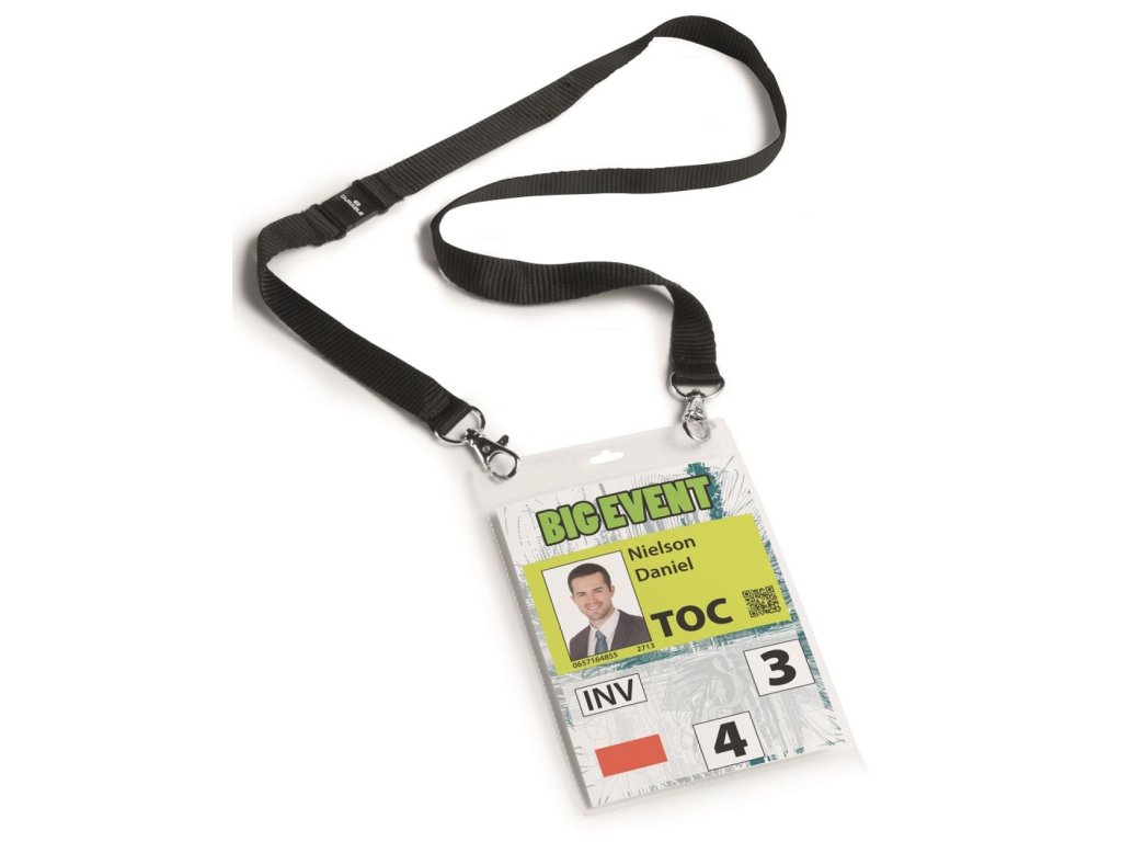 Visačka z PP s perforáciou na uchytenie a textilným remienkom šírky 20 mm s 2 karabínkami. Ideálna na vybavenie väčšieho počtu osôb na konferenciách, výstavách a pod. Dodávaná s etiketou formátu A6. Remienok čierny.Dodatočné parametre