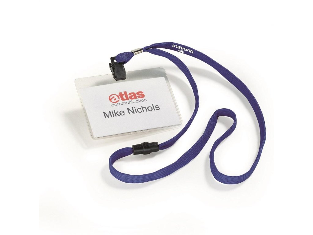 Visačka na krk s farebným bezpečnostným remienkom dĺžky 44 cm. Poistka na remienku sa uvoľní pri zachytení remienka alebo silnom potiahnutí. Materiál pevné priehľadné PVC, závesný remienok šírky 10 mm. Balenie 10 ks. Náhradné papieriky DU145602.Rozmery visačky: 90×60 mm