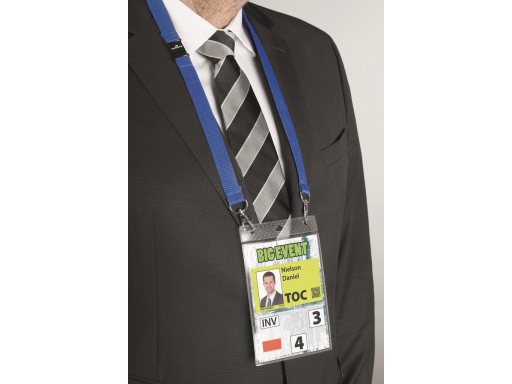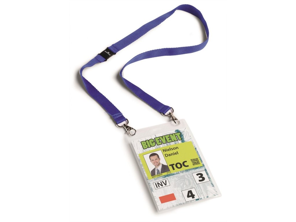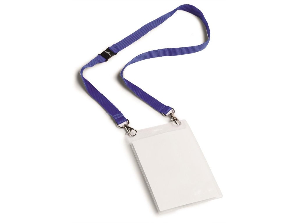 Visačka s remienkomVisačka z PP s perforáciou na uchytenie a textilným remienkom šírky 20 mm s 2 karabínkami. Ideálna na vybavenie väčšieho počtu osôb na konferenciách, výstavách a pod. Dodávaná s etiketou formátu A6. Remienok modrý.