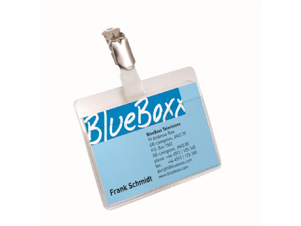 Priehľadná visačka s európskym štipcom, umiestneným na dlhšej strane visačky. Dodávaná s papierovou kartičkou rozmerov 90×60 mm. Model, pri ktorom možno menovku vyberať bez potreby odnímania štipca s remienkom. Balenie 25 ks. Farba transparentná.Rozmery: 90 x 60 mm
