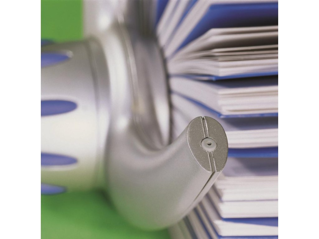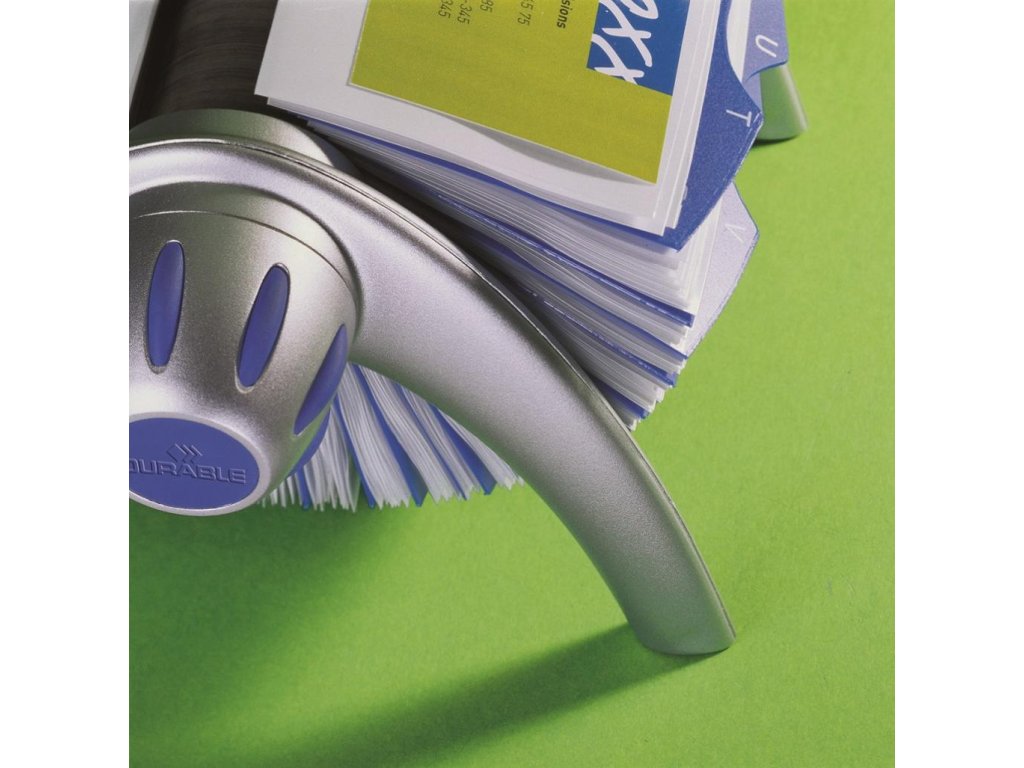 Rotačný vizitkár v exkluzívnom dizajne z plastu v kvalitnej povrchovej úprave. 200 obojstranných vreciek rozmeru 72 × 104 mm pre 400 vizitiek, abecedný rozraďovač s 25 oddielmi. Doplniteľný náhradnými vreckami Obj. kód DU241819.Farba: strieborná/modrá