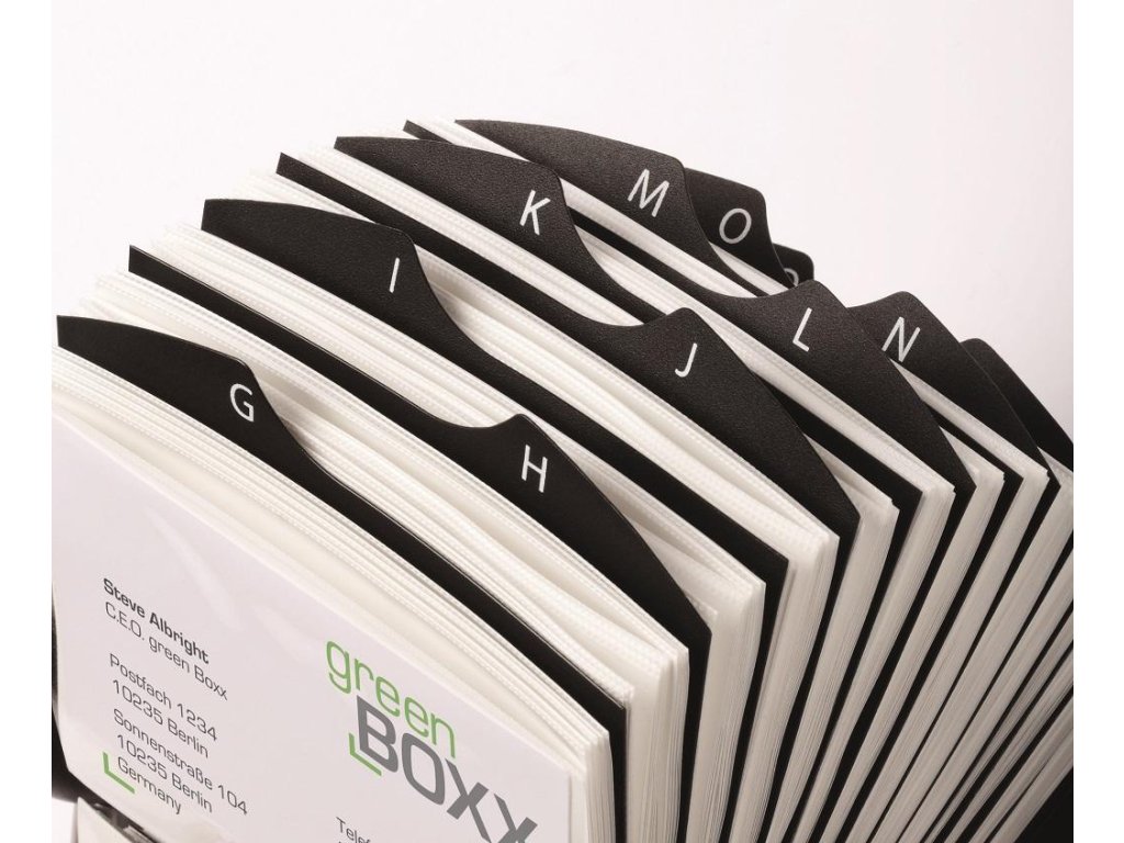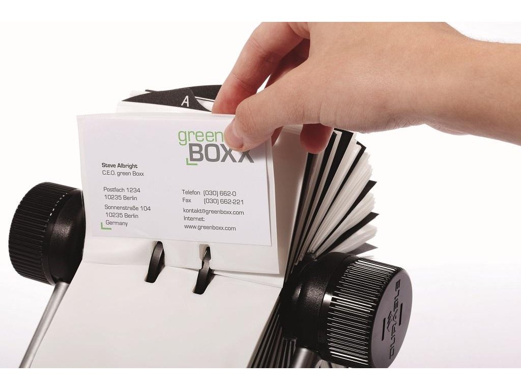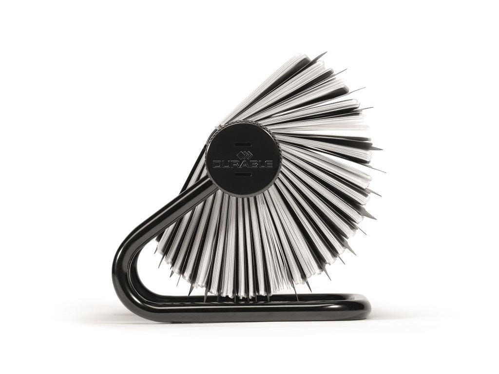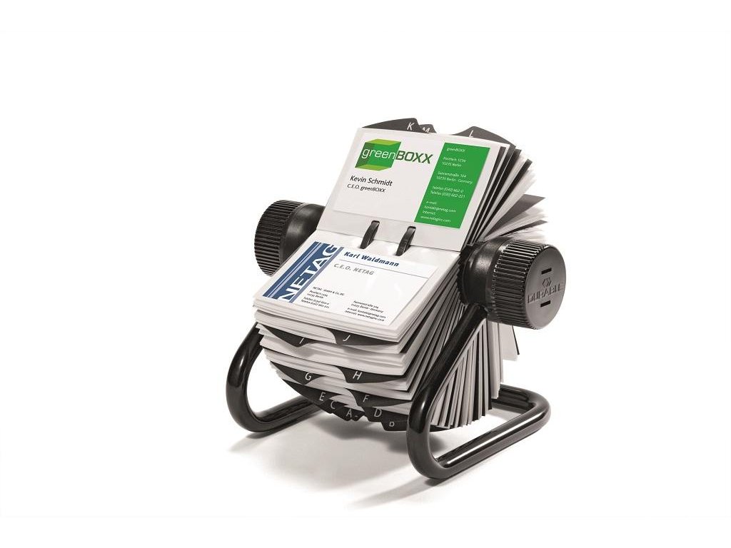 Rotačný vizitkár s 200 obojstrannými vreckami rozmerov 104 × 72 mm na 400 vizitiek. Dodávaný s 25 abecednými rozraďovačmi A - Z. Ľahký prístup k vizitkám, rýchla obsluha vďaka špeciálnemu rotačnému mechanizmu. Farba čierna.Dodatočné parametre