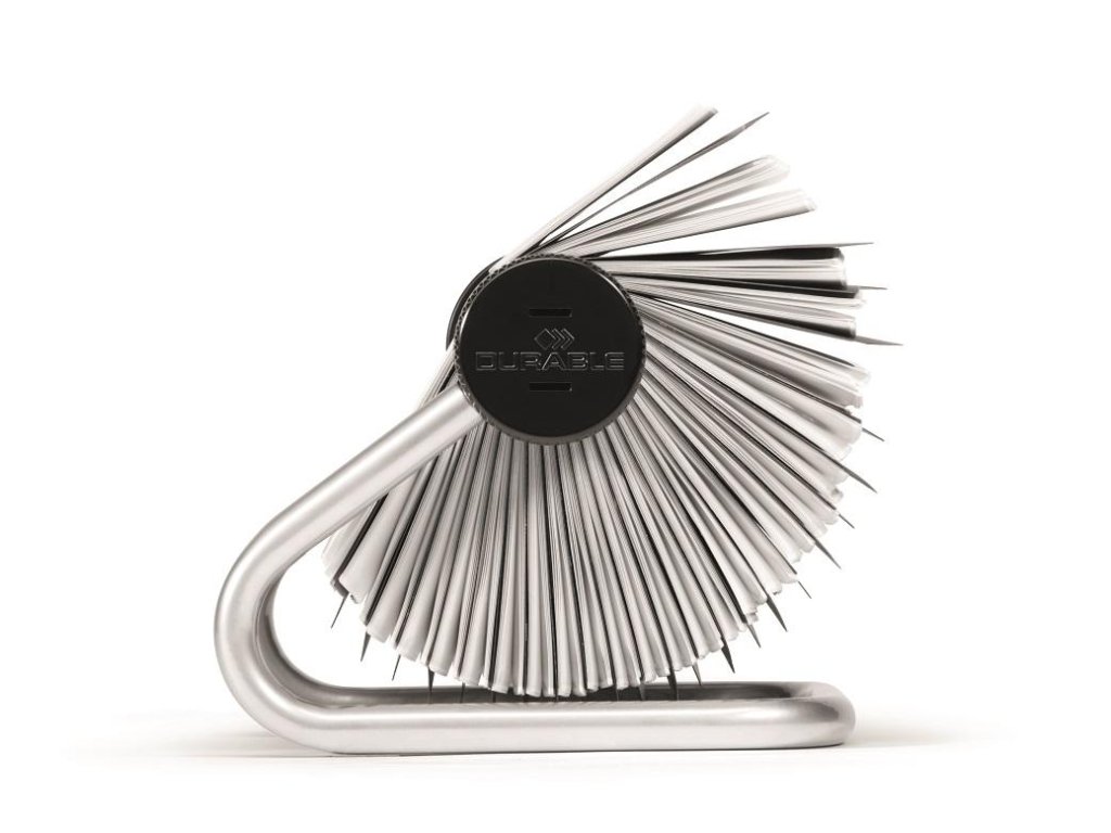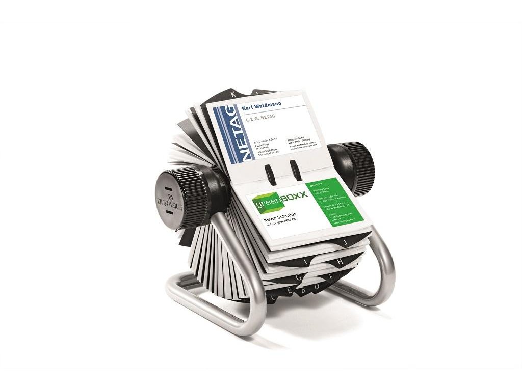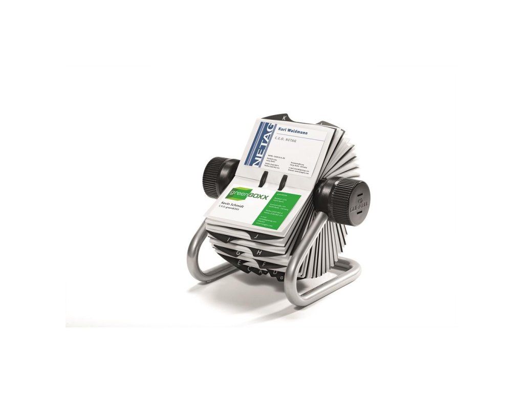 Rotačný vizitkár s 200 obojstrannými vreckami rozmerov 104 × 72 mm na 400 vizitiek. Dodávaný s 25 abecednými rozraďovačmi A - Z. Ľahký prístup k vizitkám, rýchla obsluha vďaka špeciálnemu rotačnému mechanizmu. Farba strieborná.Dodatočné parametre