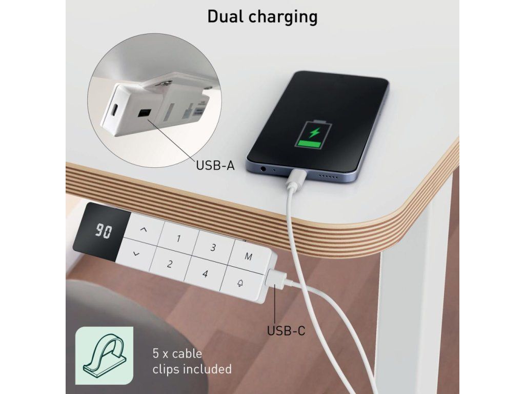 • Ovládací panel s detskou poistkou, nabíjacími portmi USB-C a USB-A, digitálnym displejom výšky, dôvtipnými pripomenutiami vstávania, ochranou proti prehriatiu a funkciou proti kolízii.
