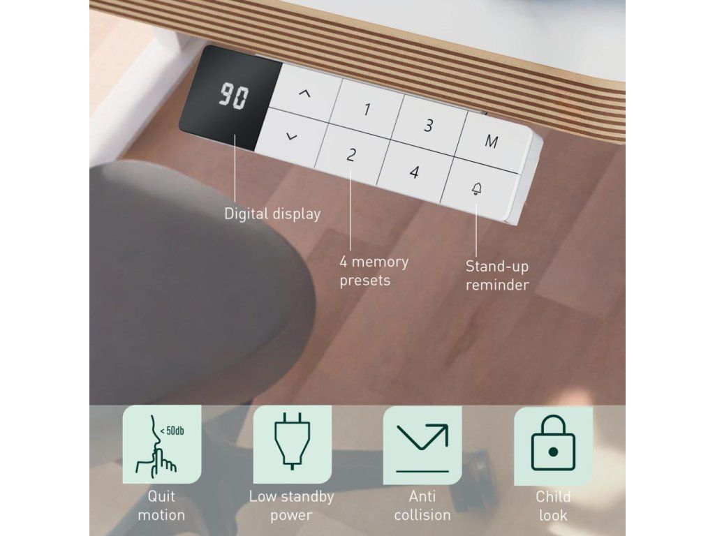 • Ovládací panel s detskou poistkou, nabíjacími portmi USB-C a USB-A, digitálnym displejom výšky, dôvtipnými pripomenutiami vstávania, ochranou proti prehriatiu a funkciou proti kolízii.